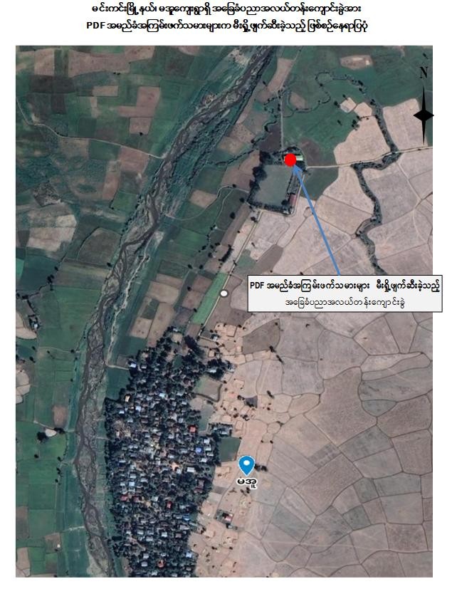 ထိုသို့ဆောင်ရွက်လျက်ရှိရာ စစ်ကိုင်းတိုင်းဒေသကြီး၊ မင်းကင်းမြို့နယ်၊ မအူကျေးရွာအတွင်းရှိ အခြေခံပညာအလယ်တန်းကျောင်းခွဲအား PDF အမည်ခံအကြမ်းဖက်သမားများက ယနေ့နံနက် ၄ နာရီခွဲခန့်တွင် လာရောက်မီးရှို့ဖျက်ဆီးခဲ့သဖြင့် လုံခြုံရေးတပ်ဖွဲ့ဝင်များက သွားရောက်မီးငြိမ်းသတ်ခဲ့ရာ နံနက် ၆ နာရီခွဲခန့်တွင် မီးငြိမ်းသွားခဲ့ပြီး အကြမ်းဖက်သမားများ၏ မီးရှို့ဖျက်ဆီးမှုကြောင့် တစ်ထပ်ဆောင် စာသင်ကျောင်း ၃ လုံးနှင့် အုပ်ချုပ်မှုအဆောက်အဦ ၃ လုံးတို့ မီးလောင်ပျက်စီးခဲ့ကြောင်း သိရှိရသည်။