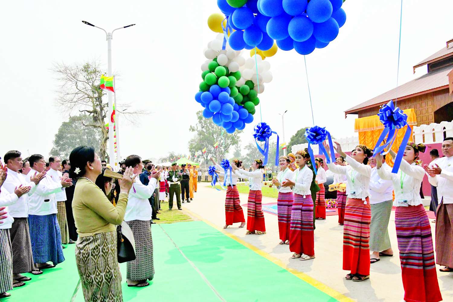 ဦးစွာ နိုင်ငံတော်စီမံအုပ်ချုပ်ရေးကောင်စီဥက္ကဋ္ဌ နိုင်ငံတော်ဝန်ကြီးချုပ်နှင့်အဖွဲ့ဝင်များသည် သိန္နီဟော်နန်းယဉ်ကျေးမှုပြတိုက်ဖွင့်ပွဲအခမ်းအနား ကျင်းပပြုလုပ်မည့် နေရာသို့ရောက်ရှိကြရာ လားရှိုးခရိုင်အုပ်ချုပ်ရေးမှူး ဦးမျိုးမင်းထွန်း၊ ဌာနဆိုင်ရာတာဝန်ရှိသူများ၊ မြို့မိမြို့ဖများ၊ ပြည်သူ့စစ်အဖွဲ့ဝင်များနှင့် ဒေသခံတိုင်းရင်းသားပြည်သူများက ရိုးရာအကအလှများဖြင့် လှိုက်လှဲနွေးထွေးစွာ ကြိုဆိုနှုတ်ဆက်ကြ သည်။