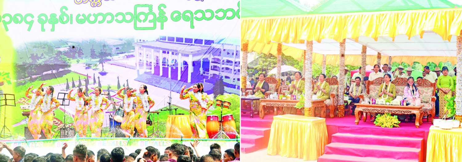 ယင်းနောက် နိုင်ငံတော်စီမံအုပ်ချုပ်ရေးကောင်စီဥက္ကဋ္ဌ တပ်မတော်ကာကွယ်ရေးဦးစီးချုပ်၏ ဇနီးနှင့်အဖွဲ့ဝင်များသည် ရေသဘင်ပွဲတော်ကို ပျော်ရွှင်စွာဆင်နွှဲနေကြသည့် ဗိုလ်လောင်းများနှင့် တပ်မတော်နည်းပညာ တက္ကသိုလ်မှ အရာရှိကြီးများအား အတာရေများ ပက်ဖျန်းကြပြီး သီဆိုကပြ ဖျော်ဖြေခဲ့ကြသည့် ယိမ်းအဖွဲ့များနှင့် အရာရှိ၊ စစ်သည် မိသားစုများအား ဂုဏ်ပြုဆုငွေများ ပေးအပ်ချီးမြှင့်သည်။