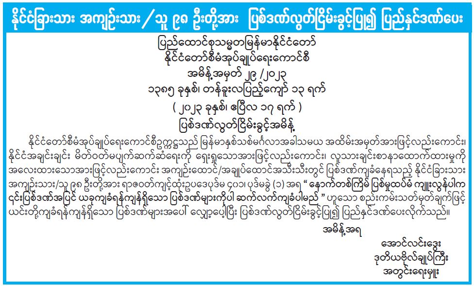နိုင်ငံခြားသား အကျဉ်းသား/သူ ၉၈ ဦးတို့အား ပြစ်ဒဏ်လွတ်ငြိမ်းခွင့်ပြု၍ ပြည်နှင်ဒဏ်ပေး 04/18/2023 နိုင်ငံခြားသား အကျဉ်းသား/သူ ၉၈ ဦးတို့အား ပြစ်ဒဏ်လွတ်ငြိမ်းခွင့်ပြု၍ ပြည်နှင်ဒဏ်ပေး