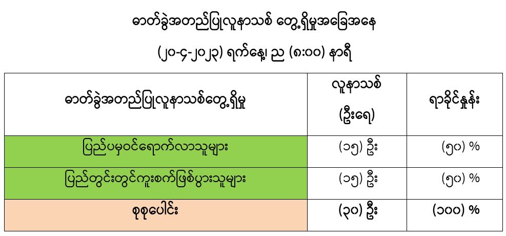 ဓာတ်ခွဲအတည်ပြုလူနာများအား နေအိမ်တွင်သီးခြားထားရှိခြင်းနှင့် ဆေးရုံများတွင် သီးခြားထားရှိကုသမှုပေးခြင်းများ ဆောင်ရွက်ခဲ့ရာ ယနေ့တွင် ပြန်လည်ကောင်းမွန်လာသူ (၇) ဦး ရှိသဖြင့် ယနေ့အထိ ပြန်လည်ကောင်းမွန်လာသူစုစုပေါင်း (၆၁၄,၆၅၆) ဦး ရှိပြီဖြစ်ပါသည်။ ယနေ့တွင် COVID-19 ရောဂါဖြင့် သေဆုံးသူမရှိသဖြင့် ယနေ့အထိ သေဆုံးသူစုစုပေါင်း (၁၉,၄၉၀) ဦးရှိပါသည်။