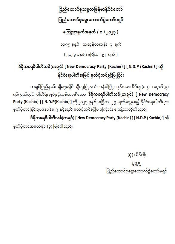 ပြည်ထောင်စုသမ္မတမြန်မာနိုင်ငံတော်ပြည်ထောင်စုရွေးကောက်ပွဲကော်မရှင် ကြေညာချက်အမှတ် ( ၈ / ၂၀၂၃ ) 04/25/2023