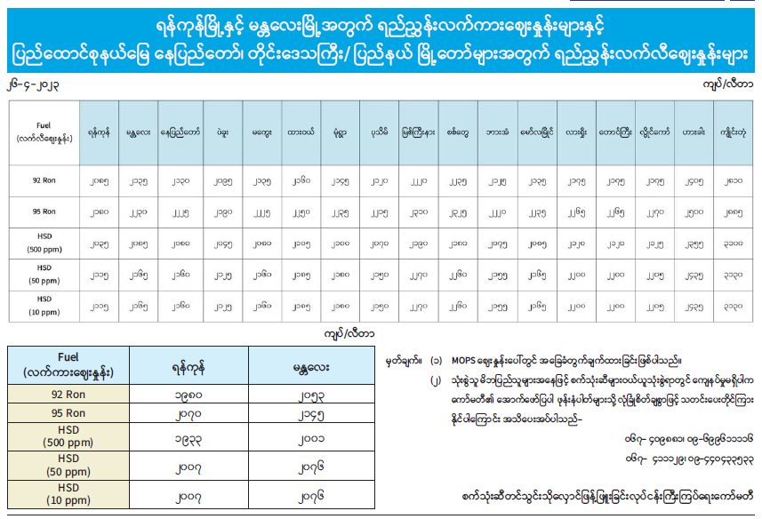 ရန်ကုန်မြို့နှင့် မန္တလေးမြို့အတွက် ရည်ညွှန်းလက်ကားဈေးနှုန်းများနှင့် ပြည်ထောင်စုနယ်မြေ နေပြည်တော်၊ တိုင်းဒေသကြီး/ပြည်နယ် မြို့တော်များအတွက် ရည်ညွှန်းလက်လီဈေးနှုန်းများ 04/26/2023