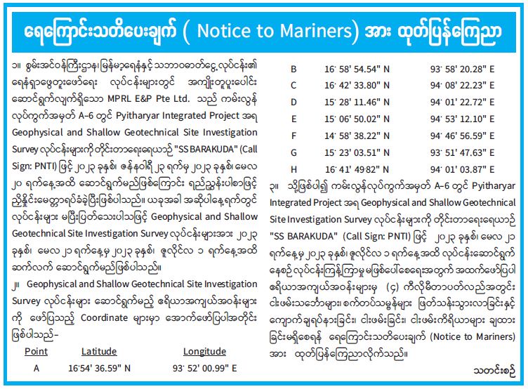 ရေကြောင်းသတိပေးချက် (Notice to Mariners) အား ထုတ်ပြန်ကြေညာ