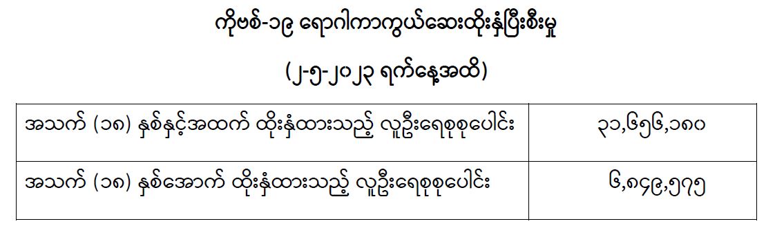 COVID-19 ရောဂါ ကာကွယ်ထိန်းချုပ်ရေးအတွက် တိုင်းဒေသကြီး/ပြည်နယ်များတွင် COVID -19 ရောဂါကာကွယ်ဆေးကို ဦးတည်အုပ်စုများသတ်မှတ်၍ ထိုးနှံပေးလျက်ရှိရာ (၂-၅-၂၀၂၃) ရက်နေ့အထိ အသက် (၁၈) နှစ်နှင့်အထက် လူဦးရေစုစုပေါင်း (၃၁,၆၅၆,၁၈၀) ဦးနှင့် အသက်(၁၈)နှစ်အောက် လူဦးရေစုစုပေါင်း (၆,၈၄၉,၅၇၅) ဦးတို့အား ထိုးနှံထားရှိပြီး ဖြစ်ပါသည်။