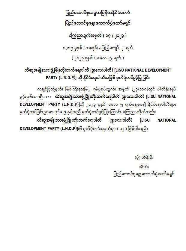 ပြည်ထောင်စုသမ္မတမြန်မာနိုင်ငံတော် ပြည်ထောင်စုရွေးကောက်ပွဲကော်မရှင် ကြေညာချက်အမှတ် ( ၁၇ / ၂၀၂၃ ) ၁၃၈၅ ခုနှစ် ၊ ကဆုန်လပြည့်ကျော် ၂ ရက် (၂၀၂၃ ခုနှစ်၊ မေလ ၅ ရက်) လီဆူအမျိုးသားဖွံ့ဖြိုးတိုးတက်ရေးပါတီ (ဒူးလေးပါတီ) [LISU NATIONAL DEVELOPMENT PARTY (L.N.D.P)] ကို နိုင်ငံရေးပါတီအဖြစ် မှတ်ပုံတင်ခွင့်ပြုခြင်း
