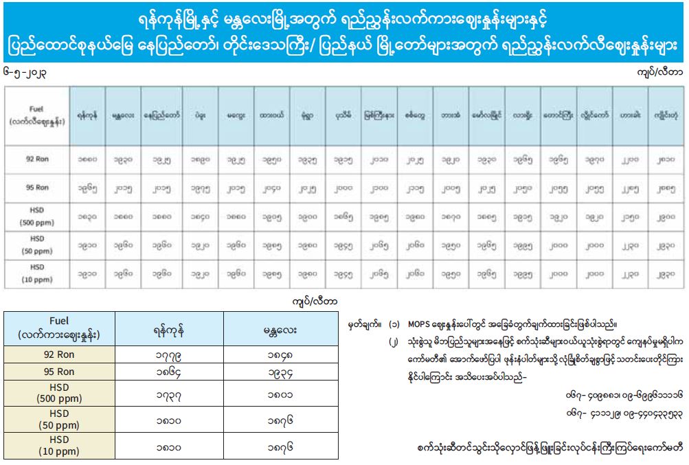 ရန်ကုန်မြို့နှင့် မန္တလေးမြို့အတွက် ရည်ညွှန်းလက်ကားဈေးနှုန်းများနှင့် ပြည်ထောင်စုနယ်မြေ နေပြည်တော်၊ တိုင်းဒေသကြီး/ ပြည်နယ် မြို့တော်များအတွက် ရည်ညွှန်းလက်လီဈေးနှုန်းများ 05/06/2023
