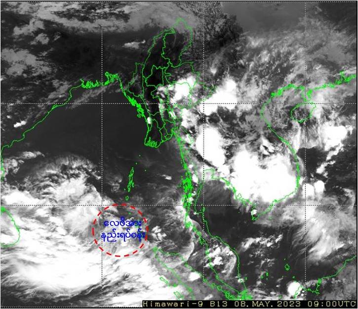 ယနေ့မြန်မာစံတော်ချိန် (၁၅:၃၀) နာရီအချိန် တိုင်းထွာချက်များအရ ဘင်္ဂလားပင်လယ်အော် အရှေ့တောင်ပိုင်းနှင့် ယင်းနှင့်ဆက်စပ်လျက်ရှိသော ကပ္ပလီပင်လယ်ပြင် တောင်ပိုင်းတို့တွင် ဖြစ်ပေါ်နေသော လေဖိအားနည်းရပ်ဝန်းသည် ဆက်လက်တည်ရှိနေပါသည်။ အဆိုပါ လေဖိအားနည်းရပ်ဝန်း (Low Pressure Area) သည် ပိုမိုအားကောင်းလာနိုင်ပြီး၊ (၉.၅.၂၀၂၃) ရက်နေ့တွင် မုန်တိုင်းငယ် (Depression) အဖြစ်သို့လည်းကောင်း၊ (၁၀.၅.၂၀၂၃) ရက်နေ့တွင် ဘင်္ဂလားပင်လယ်အော်အရှေ့တောင်ပိုင်းနှင့် ယင်းနှင့်ဆက်စပ်လျက်ရှိသော ဘင်္ဂလားပင်လယ်အော်အလယ်ပိုင်းနှင့် ကပ္ပလီပင်လယ်ပြင်တို့တွင် ဆိုင်ကလုန်းမုန်တိုင်း (Cyclonic Storm) အဖြစ်သို့လည်းကောင်း ရောက်ရှိနိုင်သည်ဟုခန့်မှန်းရပါသည်။ အဆိုပါ ဆိုင်ကလုန်းမုန်တိုင်း (Cyclonic Storm) သည် ကနဦးတွင် မြောက်-အနောက်မြောက်ဘက်သို့ ရွေ့လျားပြီး (၁၁.၅.၂၀၂၃) ရက်နေ့တွင် ဘင်္ဂလားပင်လယ်အော်အရှေ့အလယ်ပိုင်းသို့ ရောက်ရှိကာ ထိုမှတဆင့် မြောက်-အရှေ့မြောက်ဘက်သို့ကွေ့ကာ ဘင်္ဂလားဒေ့ရှ်-မြန်မာကမ်းရိုးတန်းသို့ ရွေ့လျားနိုင်သည်ဟု ခန့်မှန်းရပါသည်။
