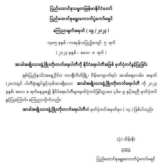 ပြည်ထောင်စုရွေးကောက်ပွဲကော်မရှင် ကြေညာချက်အမှတ် ( ၁၉ / ၂၀၂၃ )