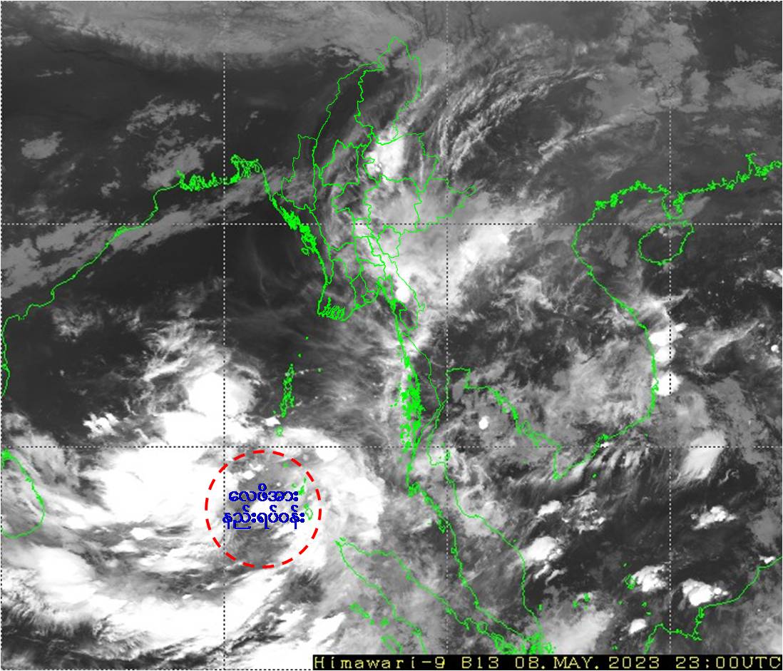 ဘင်္ဂလားပင်လယ်အော်အခြေအနေ။ ယနေ့မြန်မာစံတော်ချိန် (၀၅:၃၀)နာရီအချိန် တိုင်းထွာချက်များအရ ဘင်္ဂလားပင်လယ်အော် အရှေ့တောင်ပိုင်းနှင့် ယင်းနှင့်ဆက်စပ်လျက်ရှိသော ကပ္ပလီပင်လယ်ပြင်တောင်ပိုင်းတို့တွင် ဖြစ်ပေါ်နေသော လေဖိအားနည်း ရပ်ဝန်းသည် ဆက်လက်တည်ရှိနေပါသည်။ အဆိုပါ လေဖိအားနည်းရပ်ဝန်း(Low Pressure Area)သည် ပိုမိုအားကောင်းလာနိုင်ပြီး၊ နောက်(၁၈)နာရီအတွင်း မုန်တိုင်းငယ်(Depression)အဖြစ်သို့လည်းကောင်း၊ (၁၀.၅.၂၀၂၃)ရက်နေ့တွင် ဘင်္ဂလားပင်လယ်အော် အရှေ့တောင်ပိုင်းနှင့် ယင်းနှင့်ဆက်စပ်လျက်ရှိသော ဘင်္ဂလားပင်လယ်အော်အလယ်ပိုင်းနှင့် ကပ္ပလီပင်လယ်ပြင်တို့တွင် ဆိုင်ကလုန်း မုန်တိုင်း(Cyclonic Storm)အဖြစ်သို့လည်းကောင်း ရောက်ရှိနိုင်သည်ဟုခန့်မှန်းရပါသည်။ အဆိုပါ ဆိုင်ကလုန်းမုန်တိုင်း(Cyclonic Storm)သည် ကနဦးတွင် မြောက်-အနောက်မြောက်ဘက်သို့ ရွေ့လျားပြီး၊ (၁၁.၅.၂၀၂၃)ရက်နေ့တွင် ဘင်္ဂလားပင်လယ်အော် အရှေ့အလယ်ပိုင်းသို့ ရောက်ရှိကာ ထိုမှတဆင့် မြောက်-အရှေ့မြောက်ဘက်သို့ကွေ့ကာ ဘင်္ဂလားဒေ့ရှ်-မြန်မာကမ်းရိုးတန်းသို့ ရွေ့လျားနိုင်သည်ဟု ခန့်မှန်းရပါသည်။ ဘင်္ဂလားပင်လယ်အော်မြောက်ပိုင်းနှင့် အရှေ့အလယ်ပိုင်းတို့တွင် တိမ်အသင့်အတင့် ဖြစ်ထွန်း နေပြီး၊ ကပ္ပလီပင်လယ်ပြင်နှင့် ကျန်ဘင်္ဂလားပင်လယ်အော်တို့တွင် တိမ်ထူထပ် နေပါသည်။