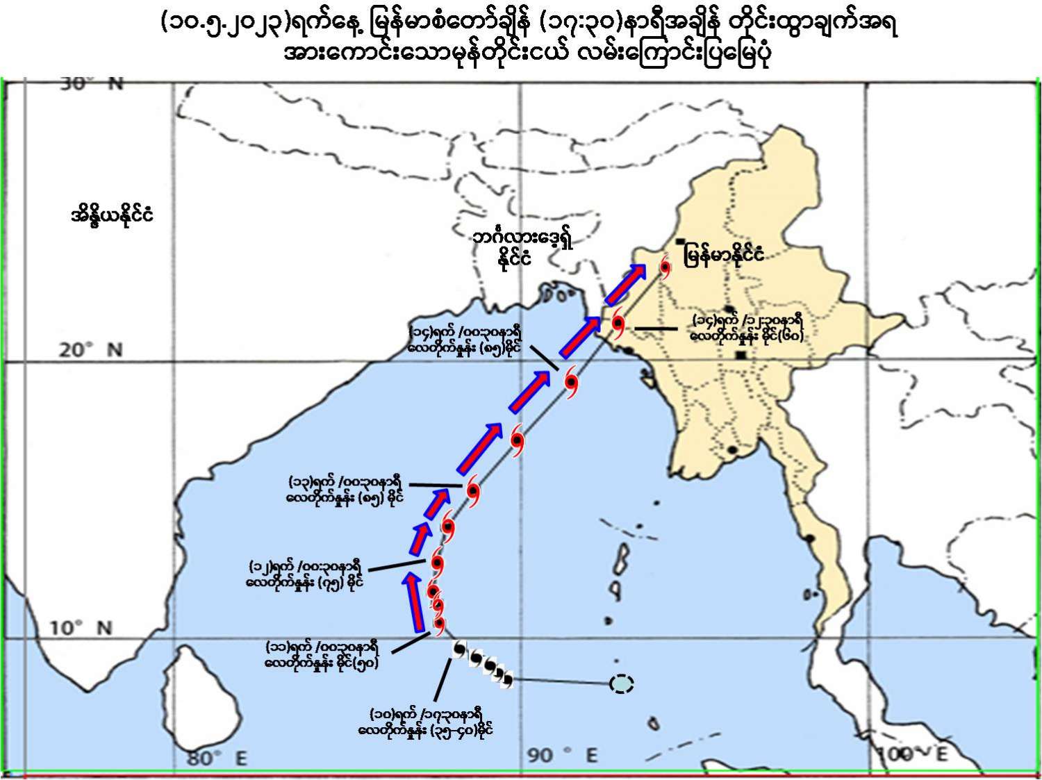 (၁) ယနေ့မြန်မာစံတော်ချိန် (၁၇:၃၀)နာရီအချိန် တိုင်းထွာချက်များအရ ဘင်္ဂလားပင်လယ်အော်အရှေ့တောင်ပိုင်းတွင် ဖြစ်ပေါ်နေသော အားကောင်းသော မုန်တိုင်းငယ်(Deep Depression)သည် မြောက်-အနောက်မြောက်ဘက်သို့ ရွေ့လျားခဲ့ပြီး၊ မြန်မာနိုင်ငံ၊ ကိုကိုးကျွန်းမြို့(Coco Island)၏ အနောက်တောင်ဘက် ရေမိုင်(၃၉၅)မိုင်ခန့်၊ ဟိုင်းကြီးကျွန်းမြို့(Hainggyigyun)၏ အနောက်တောင်ဘက် ရေမိုင်(၅၂၀)မိုင်ခန့်၊ စစ်တွေမြို့(Sittwe)၏ တောင်-အနောက်တောင်ဘက် ရေမိုင်(၆၉၅)မိုင်ခန့်၊ အိန္ဒိယနိုင်ငံ၊ နီကိုးဘားကျွန်း(Nicobar Islands)၏ အနောက်-အနောက်မြောက်ဘက် ရေမိုင်(၃၅၀)မိုင်ခန့်၊ ပို့ပလဲယား (Port Blair)၏ အနောက်တောင်ဘက် ရေမိုင်(၂၉၀)မိုင်ခန့်နှင့် ဘင်္ဂလားဒေ့ရှ် နိုင်ငံ၊ ကော့ဘဇားမြို့(Cox’s Bazar)၏ တောင်-အနောက်တောင်ဘက် ရေမိုင် (၇၃၀)မိုင်ခန့်အကွာ ပင်လယ်ပြင်ကိုဗဟိုပြုနေပါသည်။