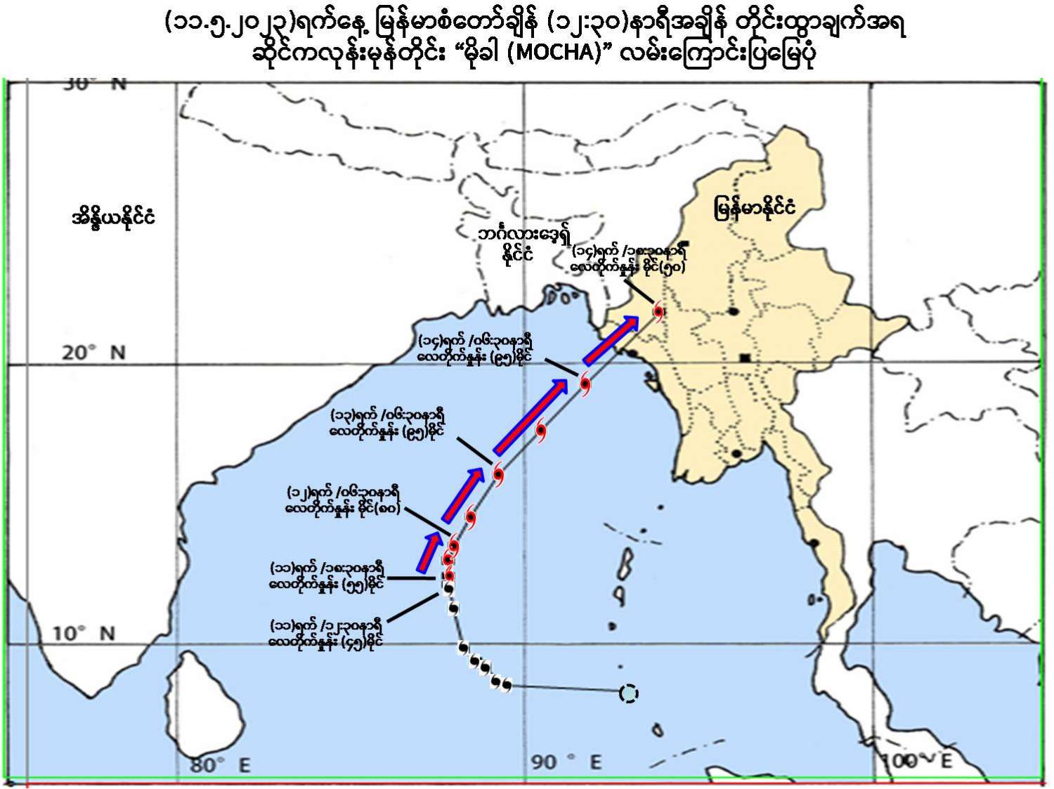 (၁) ယနေ့မြန်မာစံတော်ချိန် (၁၂:၃၀)နာရီအချိန် တိုင်းထွာချက်များအရ ဘင်္ဂလား ပင်လယ်အော်အရှေ့တောင်ပိုင်းတွင် ဖြစ်ပေါ်နေသော ဆိုင်ကလုန်းမုန်တိုင်း (Cyclonic Storm) “မိုခါ(MOCHA)” သည် မြောက်-အနောက်မြောက်ဘက်သို့ ဆက်လက်ရွေ့လျားခဲ့ပြီး၊ မြန်မာနိုင်ငံ၊ ကိုကိုးကျွန်းမြို့(Coco Island)၏ အနောက်-အနောက်တောင်ဘက် ရေမိုင်(၃၄၅)မိုင်ခန့်၊ ဟိုင်းကြီးကျွန်းမြို့ (Hainggyigyun)၏ အနောက်-အနောက်တောင်ဘက် ရေမိုင်(၄၆၀) မိုင်ခန့်၊ စစ်တွေမြို့ (Sittwe)၏ တောင်-အနောက်တောင်ဘက် ရေမိုင်(၅၈၀) မိုင်ခန့်၊ အိန္ဒိယနိုင်ငံ၊ နီကိုးဘားကျွန်း(Nicobar Islands)၏ အနောက်-အနောက် မြောက်ဘက် ရေမိုင်(၄၄၅)မိုင်ခန့်၊ ပို့ပလဲယား(Port Blair)၏ အနောက်ဘက် ရေမိုင်(၂၈၅)မိုင်ခန့်နှင့် ဘင်္ဂလားဒေ့ရှ်နိုင်ငံ၊ ကော့ဘဇားမြို့(Cox’s Bazar) ၏ တောင်-အနောက်တောင်ဘက် ရေမိုင် (၆၃၀)မိုင်ခန့်အကွာ ပင်လယ်ပြင် ကို ဗဟိုပြုနေပါသည်။