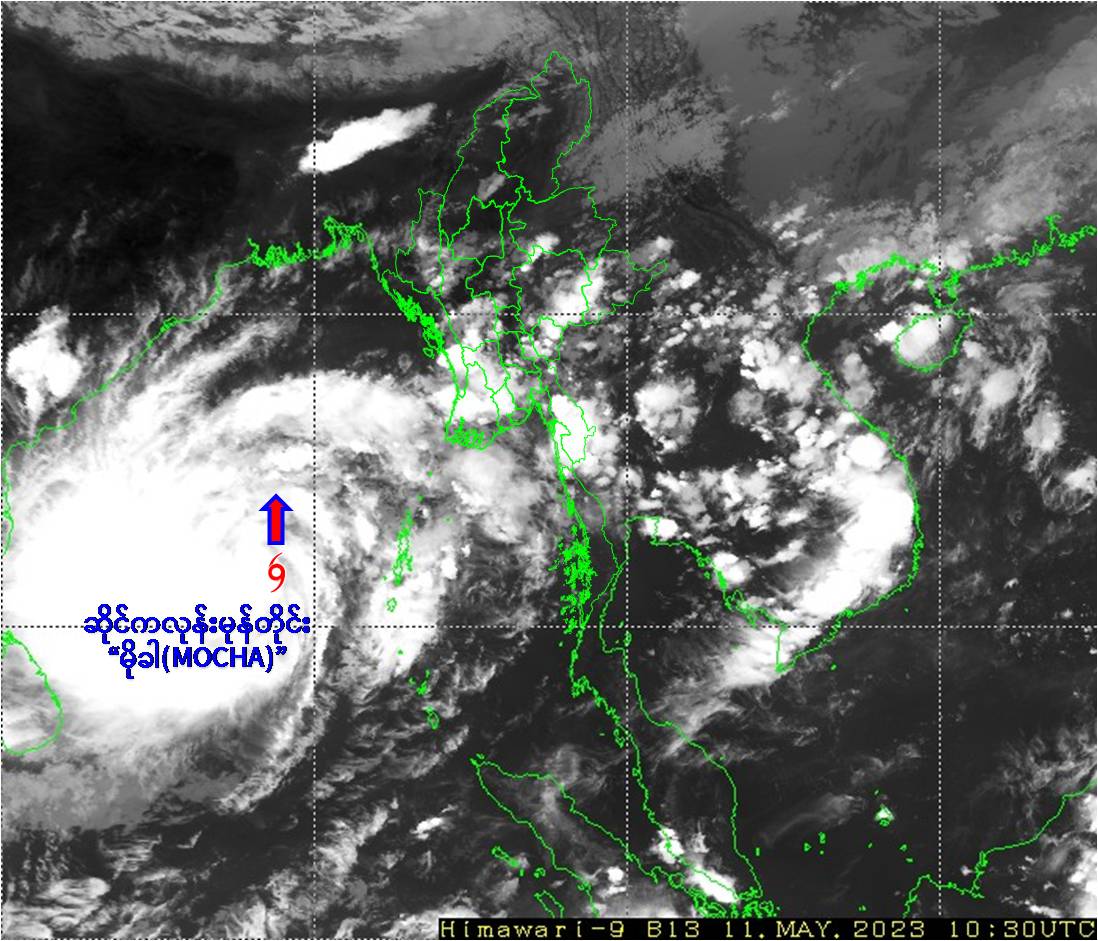 ဘင်္ဂလားပင်လယ်အော်အခြေအနေ။ ယနေ့မြန်မာစံတော်ချိန် (၁၇:၀၀) နာရီအချိန် တိုင်းထွာချက်များအရ ဘင်္ဂလားပင်လယ်အော်အရှေ့တောင်ပိုင်းတွင် ဖြစ်ပေါ်နေသော ဆိုင်ကလုန်းမုန်တိုင်း (Cyclonic Storm) “မိုခါ(MOCHA)” သည် မြောက်ဘက်သို့ ရွေ့လျားခဲ့ပြီး၊ မြန်မာနိုင်ငံ၊ ကိုကိုးကျွန်းမြို့(Coco Island)၏ အနောက်-အနောက်တောင်ဘက် ရေမိုင် (၃၄၀) မိုင်ခန့်၊ ဟိုင်းကြီးကျွန်းမြို့ (Hainggyigyun) ၏ အနောက်တောင်ဘက် ရေမိုင်(၄၅၅) မိုင်ခန့်၊ စစ်တွေမြို့ (Sittwe) ၏ တောင်-အနောက်တောင်ဘက် ရေမိုင်(၅၇၅) မိုင်ခန့်၊ အိန္ဒိယနိုင်ငံ၊ နီကိုးဘားကျွန်း(Nicobar Islands)၏ အနောက်-အနောက်မြောက်ဘက် ရေမိုင်(၄၅၀)မိုင်ခန့်၊ ပို့ပလဲယား(Port Blair)၏ အနောက်ဘက် ရေမိုင်(၂၈၅)မိုင်ခန့်နှင့် ဘင်္ဂလားဒေ့ရှ်နိုင်ငံ၊ ကော့ဘဇားမြို့(Cox’s Bazar)၏ တောင်-အနောက်တောင်ဘက် ရေမိုင်(၆၂၀)မိုင်ခန့်အကွာ ပင်လယ်ပြင်ကို ဗဟိုပြုနေပါသည်။ ကပ္ပလီပင်လယ်ပြင်တောင်ပိုင်းနှင့် ဘင်္ဂလားပင်လယ်အော်မြောက်ပိုင်း တို့တွင် တိမ်အသင့်အတင့် ဖြစ်ထွန်းနေပြီး၊ ကပ္ပလီပင်လယ်ပြင်မြောက်ပိုင်းနှင့် ကျန်ဘင်္ဂလားပင်လယ်အော်တို့တွင် တိမ်ထူထပ်နေပါသည်။