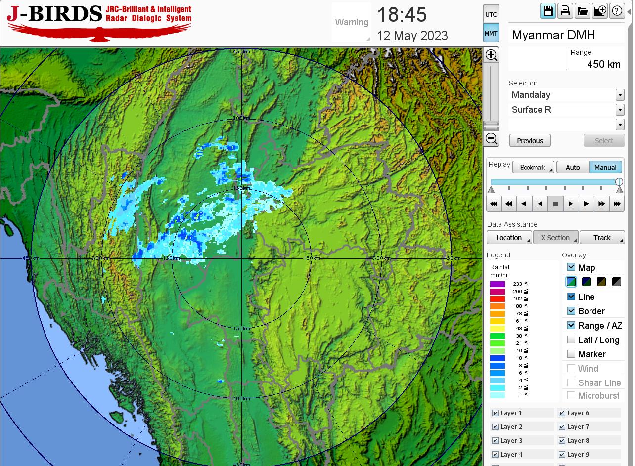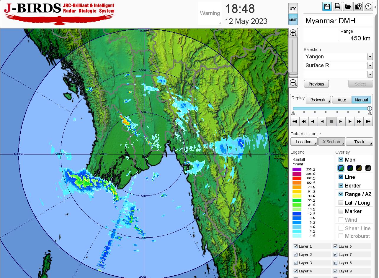 မိုးတိမ်တောင်ဖြစ်ပေါ်မှုအခြေအနေ။ ဘင်္ဂလားပင်လယ်အော်အလယ်ပိုင်းတွင် ဖြစ်ပေါ်နေသော အားအလွန်ကောင်းသော ဆိုင်ကလုန်းမုန်တိုင်း(Very Severe Cyclonic Storm) “မိုခါ (MOCHA)”မှ ပြတ်ထွက်လာသော တိမ်တိုက်များကြောင့် တစ်ပြည်လုံးတွင် မိုးတိမ်တောင်များ ဖြစ်ထွန်းမှု အားကောင်းနေပြီး၊ အဆိုပါ မိုးတိမ်တောင်များ ရွေ့လျားရာနေရာတစ်လျှောက်တွင် မိုးရွာသွန်းခြင်းနှင့်အတူ လေပြင်းတိုက်ခတ်ခြင်း၊ မိုးထစ်ချုန်းခြင်း၊ မိုးကြိုးပစ်ခြင်း၊ လျှပ်စီးလက်ခြင်းနှင့် မိုးသီးကြွေခြင်းစသည့် မိုးလေဝသဖြစ်စဉ်များ ဖြစ်ပေါ်နိုင်ပါသဖြင့် ကြိုတင် သတိပြုနိုင်ပါရန် အကြံပြုအပ်ပါသည်။