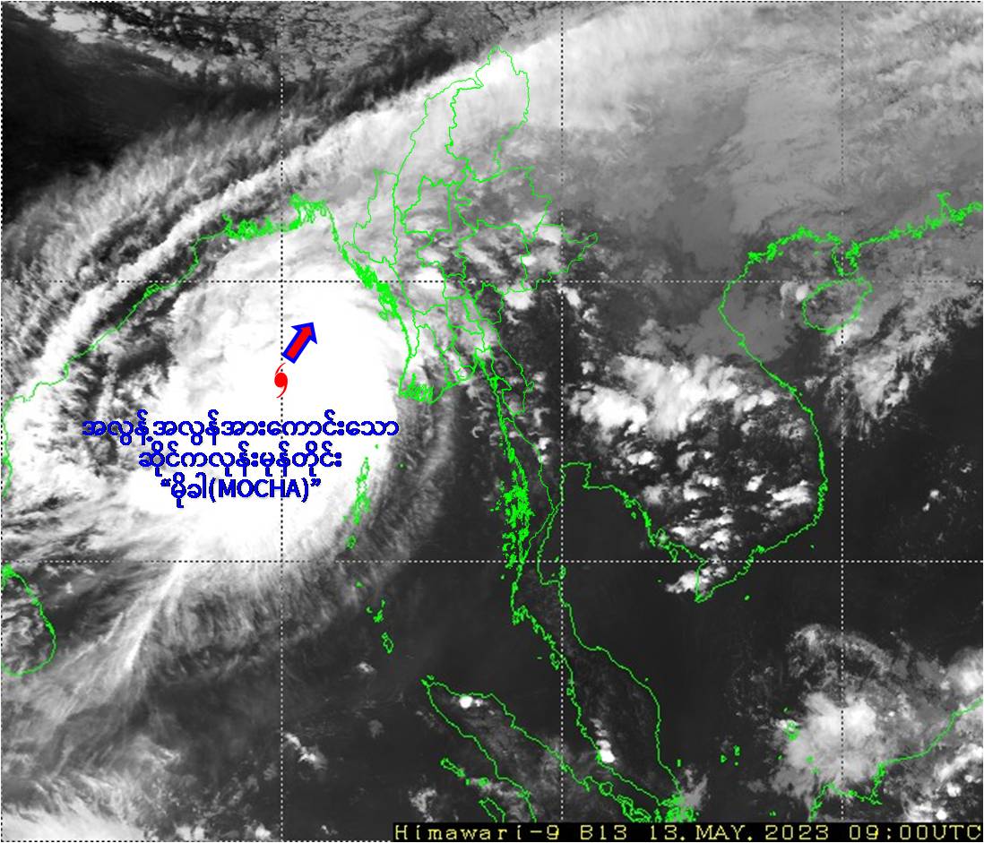 (၁) ယနေ့မြန်မာစံတော်ချိန် (၁၅:၃၀)နာရီအချိန် တိုင်းထွာချက်များအရ ဘင်္ဂလား ပင်လယ်အော်အရှေ့အလယ်ပိုင်းတွင် ဖြစ်ပေါ်နေသော အလွန့်အလွန်အား ကောင်းသောဆိုင်ကလုန်းမုန်တိုင်း(Extremely Severe Cyclonic Storm) “မိုခါ”(MOCHA)သည် အရှေ့မြောက်ဘက်သို့ ရွေ့လျားခဲ့ပြီး၊ မြန်မာနိုင်ငံ၊ ကိုကိုးကျွန်းမြို့(Coco Island)၏ အနောက်-အနောက်မြောက်ဘက် ရေမိုင် (၂၄၀)မိုင်ခန့်၊ ဟိုင်းကြီးကျွန်းမြို့(Hainggyigyun)၏ အနောက်ဘက်ရေမိုင် (၂၅၀)မိုင်ခန့်၊ စစ်တွေမြို့ (Sittwe)၏ တောင်-အနောက်တောင်ဘက် ရေမိုင် (၂၈၀)မိုင်ခန့်၊ အိန္ဒိယနိုင်ငံ၊ ပို့ပလဲယား(Port Blair)၏ အနောက်မြောက်ဘက် ရေမိုင်(၃၂၀)မိုင်ခန့်နှင့် ဘင်္ဂလားဒေ့ရှ်နိုင်ငံ၊ ကော့ဘဇားမြို့(Cox’s Bazar)၏ တောင်-အနောက်တောင်ဘက် ရေမိုင်(၃၃၅)မိုင်ခန့်အကွာ ပင်လယ်ပြင်ကို ဗဟိုပြုနေပါသည်။