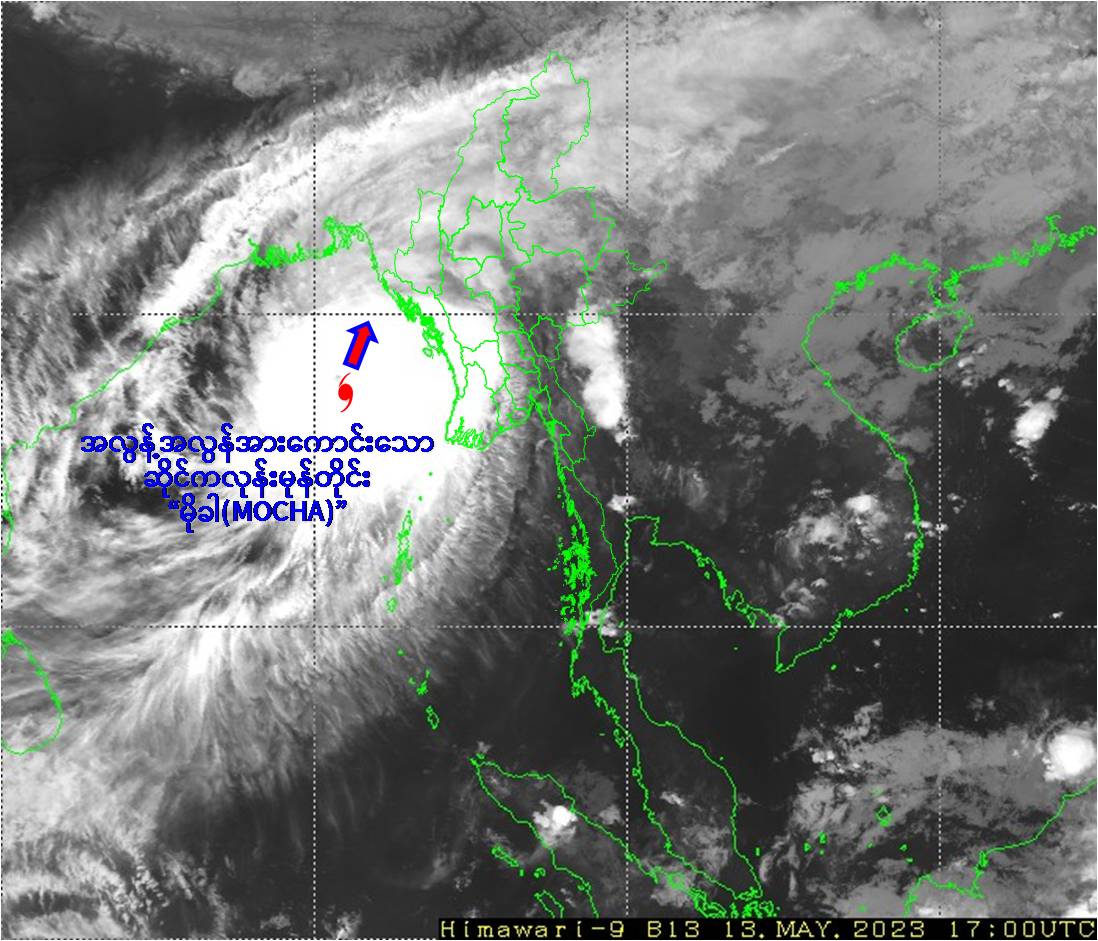 (၁) ယနေ့မြန်မာစံတော်ချိန် (၂၃:၃၀)နာရီအချိန် တိုင်းထွာချက်များအရ ဘင်္ဂလားပင်လယ်အော် အရှေ့အလယ်ပိုင်းတွင် ဖြစ်ပေါ်နေသောအလွန့်အလွန်အားကောင်းသောဆိုင်ကလုန်းမုန်တိုင်း(Extremely Severe Cyclonic Storm) “မိုခါ”(MOCHA) သည် မြောက်-အရှေ့မြောက်ဘက်သို့ ရွေ့လျားခဲ့ပြီး၊ မြန်မာနိုင်ငံ၊ ကိုကိုးကျွန်းမြို့ (Coco Island) ၏ အနောက်မြောက်ဘက် ရေမိုင် (၂၃၅) မိုင်ခန့်၊ ဟိုင်းကြီးကျွန်းမြို့(Hainggyigyun)၏ အနောက်-အနောက်မြောက်ဘက်ရေမိုင်(၂၀၀)မိုင်ခန့်၊ စစ်တွေမြို့(Sittwe)၏ တောင်-အနောက်တောင်ဘက် ရေမိုင် (၁၈၀) မိုင်ခန့်၊ အိန္ဒိယနိုင်ငံ၊ ပို့ပလဲယား(Port Blair)၏ မြောက်-အနောက်မြောက်ဘက် ရေမိုင် (၃၆၅) မိုင်ခန့်နှင့် ဘင်္ဂလားဒေ့ရှ်နိုင်ငံ၊ ကော့ဘဇားမြို့ (Cox’s Bazar) ၏တောင်-အနောက်တောင်ဘက် ရေမိုင် (၂၄၀) မိုင်ခန့်အကွာ ပင်လယ်ပြင်ကို ဗဟိုပြုနေပါသည်။