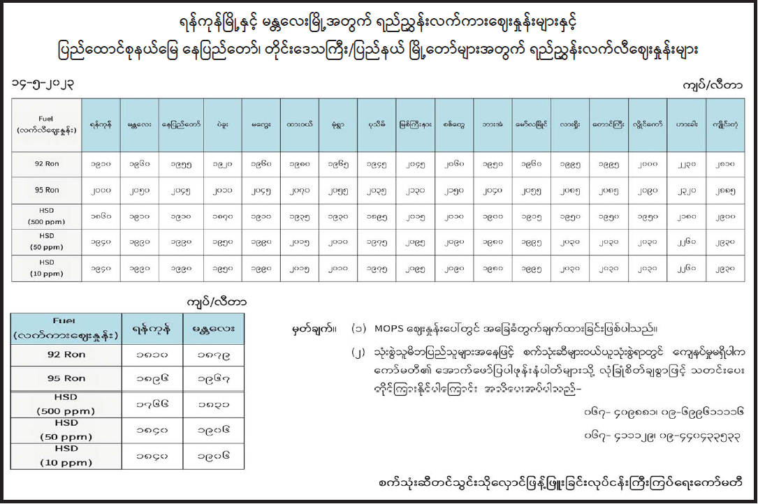 ရန်ကုန်မြို့နှင့် မန္တလေးမြို့အတွက် ရည်ညွှန်းလက်ကားဈေးနှုန်းများနှင့် ပြည်ထောင်စုနယ်မြေ နေပြည်တော်၊ တိုင်းဒေသကြီး/ပြည်နယ် မြို့တော်များအတွက် ရည်ညွှန်းလက်လီဈေးနှုန်းများ 05/14/2023