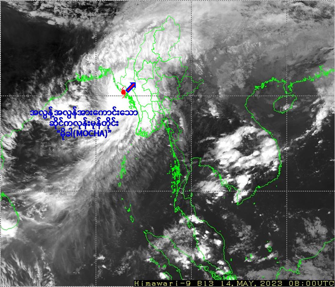 ဘင်္ဂလားပင်လယ်အော်အခြေအနေ။ ယနေ့မြန်မာစံတော်ချိန်(၁၄:၃၀)နာရီအချိန် တိုင်းထွာချက်များအရ ဘင်္ဂလားပင်လယ်အော်အရှေ့မြောက်ပိုင်းနှင့် ယင်းနှင့်ဆက်စပ်လျက်ရှိသော ဘင်္ဂလားပင်လယ်အော် အရှေ့အလယ်ပိုင်းတို့တွင် ဖြစ်ပေါ်နေသော အလွန့်အလွန်အားကောင်းသော ဆိုင်ကလုန်းမုန်တိုင်း (Extremely Severe Cyclonic Storm)“မိုခါ”(MOCHA)သည် မြောက်-အရှေ့မြောက်ဘက်သို့ ရွေ့လျားခဲ့ပြီး၊ မြန်မာနိုင်ငံ၊ စစ်တွေမြို့အနီးမှကုန်းတွင်းသို့ ဖြတ်ကျော်လျက်ရှိပါသည်။ကပ္ပလီပင်လယ်ပြင်တောင်ပိုင်းတွင် တိမ်အသင့်အတင့်ဖြစ်ထွန်းနေပြီး၊ ကပ္ပလီပင်လယ်ပြင်မြောက်ပိုင်းနှင့် ဘင်္ဂလားပင်လယ်အော်တို့တွင် တိမ်ထူထပ်နေပါသည်။