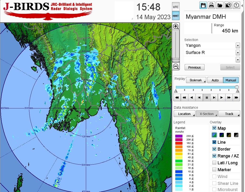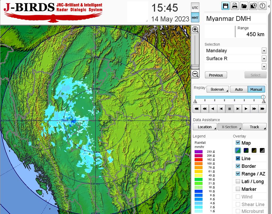 မိုးတိမ်တောင်ဖြစ်ပေါ်မှုအခြေအနေ။ မြန်မာနိုင်ငံ၊ စစ်တွေမြို့အနီးမှကုန်းတွင်းသို့ ဖြတ်ကျော်လျက်ရှိသော အလွန့်အလွန်အားကောင်းသော ဆိုင်ကလုန်းမုန်တိုင်း “မိုခါ(MOCHA)”မှ ပြတ်ထွက်လာသော တိမ်တိုက်များကြောင့် မြန်မာနိုင်ငံတောင်ပိုင်းဒေသများမှလွဲ၍ ကျန်တိုင်းဒေသကြီးနှင့် ပြည်နယ်တို့တွင် မိုးတိမ်တောင်များဖြစ်ထွန်းမှုအားကောင်းနေပြီး၊ အဆိုပါမိုးတိမ်တောင်များ ရွေ့လျားရာနေရာတစ်လျှောက်တွင် မိုးရွာသွန်းခြင်းနှင့်အတူ လေပြင်းတိုက်ခတ်ခြင်း၊ မိုးထစ်ချုန်းခြင်း၊ မိုးကြိုးပစ်ခြင်း၊ လျှပ်စီးလက်ခြင်းနှင့် မိုးသီးကြွေခြင်း စသည့်မိုးလေဝသဖြစ်စဉ်များ ဖြစ်ပေါ်နိုင်ပါသဖြင့် ကြိုတင်သတိပြုနိုင်ပါရန် အကြံပြုအပ်ပါသည်။