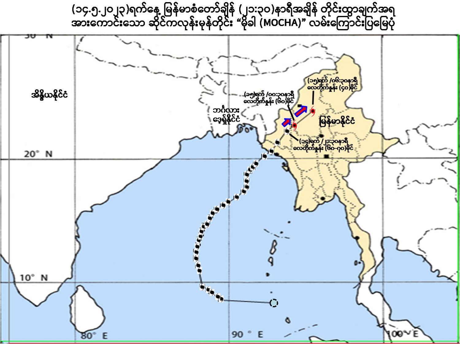 (၁) ယနေ့မြန်မာစံတော်ချိန် (၂၁:၃၀)နာရီအချိန် တိုင်းထွာချက်များအရ ချင်းပြည်နယ်၊ ပလက်ဝမြို့အနီးမှကုန်းတွင်းသို့ ဖြတ်ကျော်ဝင်ရောက်ခဲ့သော အားအလွန်ကောင်းသော ဆိုင်ကလုန်းမုန်တိုင်း(Very Severe Cyclonic Storm) “မိုခါ”(MOCHA)သည် မြောက်-အရှေ့မြောက်ဘက်သို့ ရွေ့လျားခဲ့ပြီး၊ အားကောင်းသောဆိုင်ကလုန်းမုန်တိုင်း(Severe Cyclonic Storm) “မိုခါ” (MOCHA)အဖြစ်သို့ အားလျော့သွားခဲ့ကာ မတူပီမြို့အနီးမှ မြောက်-အရှေ့ မြောက်ဘက်သို့ ဆက်လက်ရွေ့လျားလျက်ရှိပါသည်။