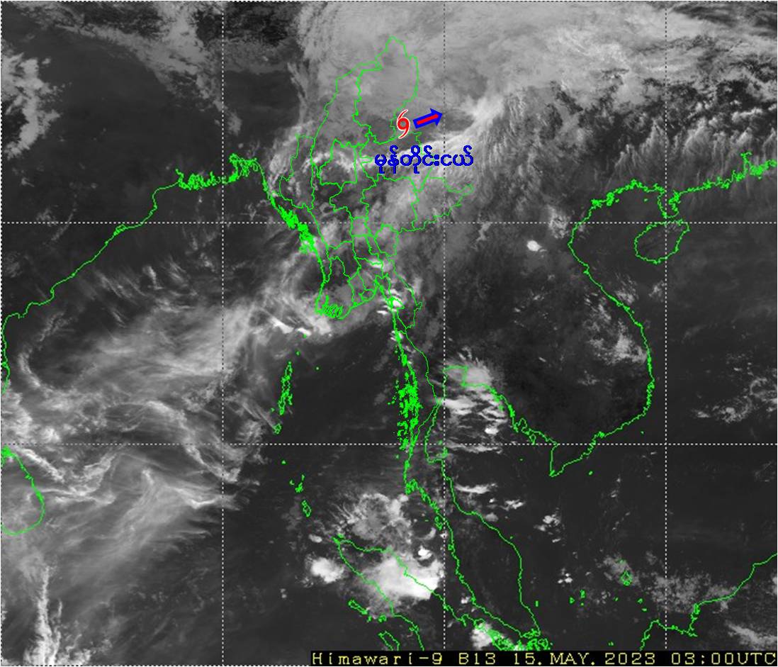 (၁) ယနေ့မြန်မာစံတော်ချိန် (၀၉:၃၀)နာရီအချိန် တိုင်းထွာချက်များအရ စစ်ကိုင်း တိုင်းဒေသကြီးအထက်ပိုင်း၊ ကသာမြို့အနီးမှ ကုန်းတွင်းသို့ ရွေ့လျားဝင်ရောက် ခဲ့သော ဆိုင်ကလုန်းမုန်တိုင်း(Cyclonic Storm) “မိုခါ” (MOCHA)သည် ကချင်ပြည်နယ်၊ ဗန်းမော်မြို့အနီးမှ အရှေ့-အရှေ့မြောက်ယွန်းယွန်းသို့ ရွေ့လျားခဲ့ပြီး၊ တရုတ်-မြန်မာနယ်စပ်တွင် မုန်တိုင်းငယ်(Depression) အဖြစ်သို့ အားလျော့သွားခဲ့ကာ၊ နောက်(၃)နာရီအတွင်း လေဖိအားနည်းရပ်ဝန်း (Low Pressure Area)အဖြစ် တဖြည်းဖြည်း အားလျော့သွားမည်ဟု ခန့်မှန်း ရပါသည်။
