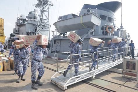 အလားတူ စစ်ရေယာဉ်(မုတ္တမ)သည် ကာကွယ်ရေးဦးစီးချုပ်ရုံး (ကြည်း) မှ ၅ ဦးစာ ရိက္ခာထုတ် ၆,၀၀၀ ထုတ် (၆၀ တန်ခန့်)၊ လူမှုဝန်ထမ်းကယ်ဆယ်ရေးနှင့် ပြန်လည်နေရာချထားရေးဝန်ကြီးဌာနမှ ဆန်အိတ် ၁၂,၀၀၀ အိတ် (၆၀၀ တန်)၊ တာပေါ်လင်လိတ် ၁၀၀၀ လိတ် (၃၇ တန်)၊ နိုင်ငံတော်စီမံအုပ်ချုပ်ရေးကောင်စီဉက္ကဋ္ဌရုံးမှ ဆန် ၅ ပြည်ဝင် အိတ် ၁၀,၀၀၀ အိတ် (၁၀၅ တန်ခန့်)၊ မြန်မာ့စီးပွားရေးဦးပိုင်အများနှင့်သက်ဆိုင်သော ကုမ္ပဏီလီမိတက်မှ ဆောက်လုပ်ရေးလုပ်ငန်းသုံးပစ္စည်းများဖြစ်သည့် အိမ်ရိုက်သံ ၃၅ တန်၊ သွပ် ၄၀,၀၀၀ ချပ် (၁၆၀ တန်)၊ ပို့ဆောင်ရေးနှင့်ဆက်သွယ်ရေးဝန်ကြီးဌာနမှ MPT Mobile ကား ၁ စီး (၅ တန်)၊ ဆက်သွယ်ရေးတာဝါတိုင်နှင့် ဆက်စပ်ပစ္စည်း ၁၇ တန်၊ စုစုပေါင်း ၁,၀၁၉ တန်ခန့်အား ဗိုလ်အောင်ကျော်ဆိပ်ကမ်းတွင်လည်းကောင်း၊ စစ်ရေယာဉ် (မဟာဗန္ဓုလ) သည် ကာကွယ်ရေးဦးစီးချုပ်ရုံး (ရေ) မှ ခေါက်ဆွဲခြောက် ၁၁၃ ဖာ၊ ဓာတ်ဆားထုတ် ၈,၈၀၀ ထုတ်၊ ကြက်ဥ ၅,၀၀၀ လုံး၊ ရေသန့်နှင့် အသား/ငါးများ၊ ငါးပိ ၁၀၀ ပိဿာ၊ ငါးခြောက် ၈၀၀ ပိဿာ၊ ရန်ကုန်တိုင်းစစ်ဌာနချုပ်မှ ကြက်ဥ ၁၀,၀၀၀ လုံး၊ လူမှုဝန်ထမ်းကယ်ဆယ်ရေးနှင့် ပြန်လည်နေရာချထားရေးဝန်ကြီးဌာနမှ ဆန်အိတ် ၅၀၀ အိတ် (၂၅ တန်)၊ စုစုပေါင်း ၂၈.၂ တန်ခန့်အား အမှတ် (၄) ရေတပ်ဆိပ်ခံတံတားတွင်လည်းကောင်း တင်ဆောင်လျက်ရှိပြီး ကူညီကယ်ဆယ်ရေးဆောင်ရွက်မည့် အဖွဲ့များအားတင်ဆောင်၍ မေ ၁၆ ရက် နံနက်ပိုင်းတွင် ရခိုင်ပြည်နယ်၊ စစ်တွေမြို့သို့ပို့ဆောင်ရန် ထွက်ခွာသွားမည်ဖြစ်သည်။