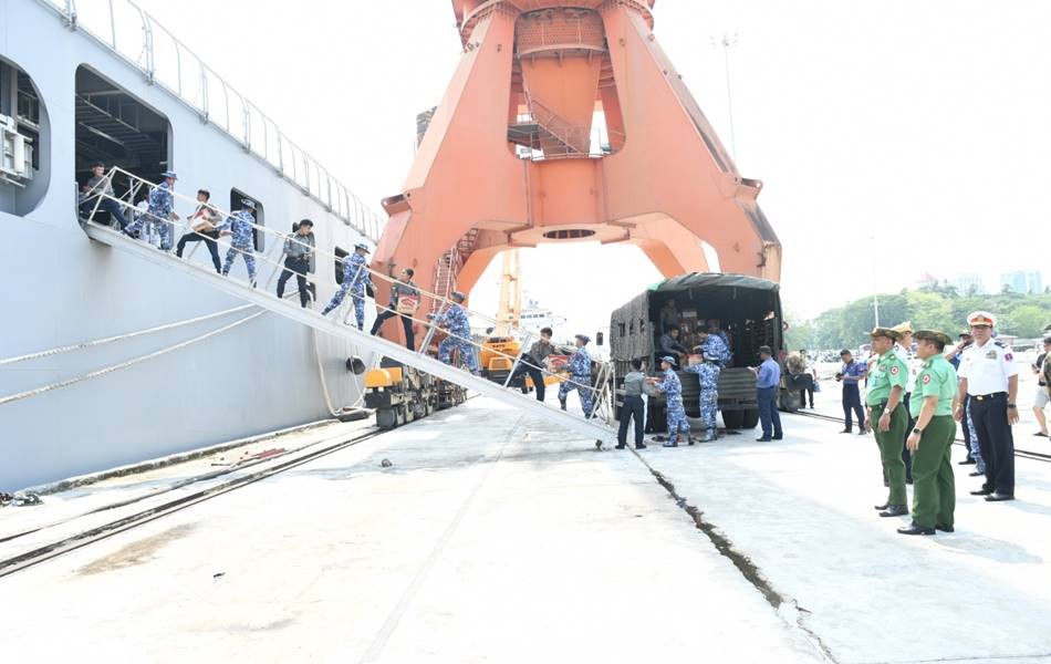 အဆိုပါ တပ်မတော်(ရေ)မှ စစ်ရေယာဉ်များပေါ်သို့ ကူညီကယ်ဆယ်ရေးပစ္စည်းများနှင့် ထောက်ပံ့ပစ္စည်းများ တင်ဆောင်နေမှုများကို ယနေ့နေ့လယ်ပိုင်းတွင် ရန်ကုန်တိုင်းစစ်ဌာနချုပ်တိုင်းမှူး ဗိုလ်ချုပ် ဇော်ဟိန်းနှင့် တာဝန်ရှိသူများက သွားရောက်ကြည့်ရှုစစ်ဆေးသည်။