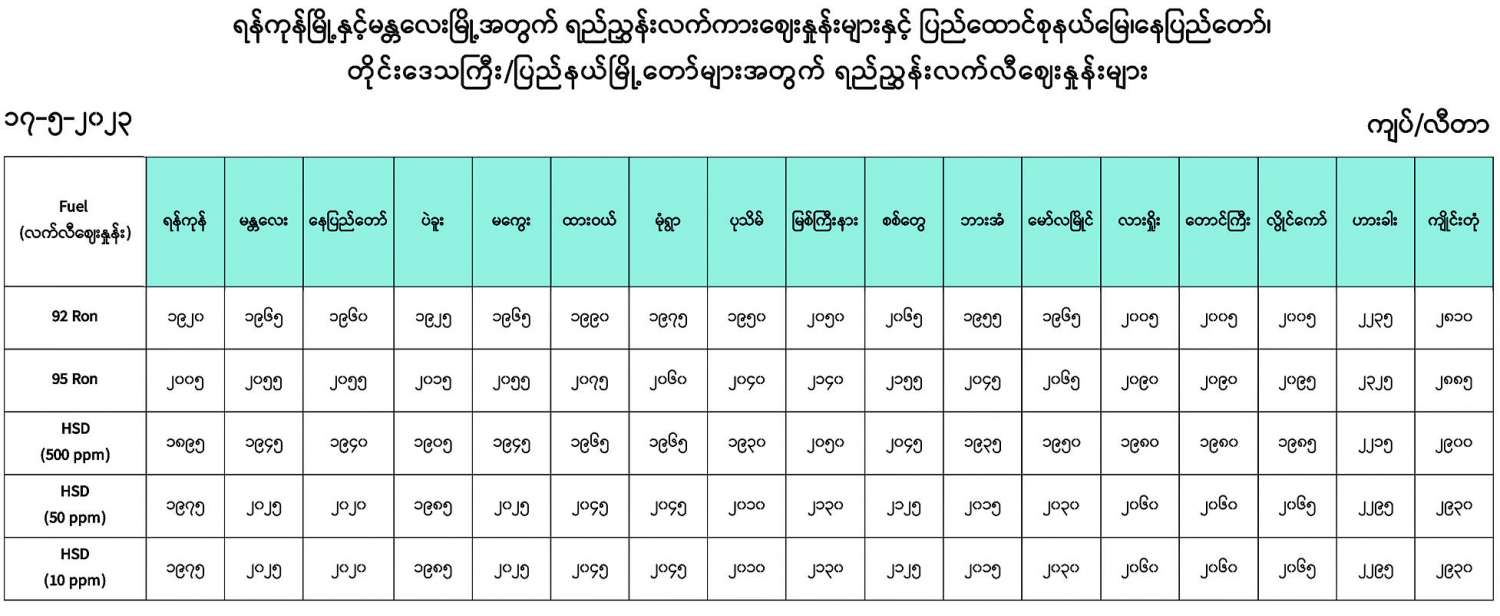 ရန်ကုန်နှင့်မန္တလေးမြို့အတွက် ရည်ညွှန်းလက်ကားဈေးနှုန်းများနှင့် ပြည်ထောင်စုနယ်မြေ နေပြည်တော်၊ တိုင်းဒေသကြီး/ပြည်နယ် မြို့တော်များအတွက် ရည်ညွှန်းလက်လီဈေးနှုန်းများ