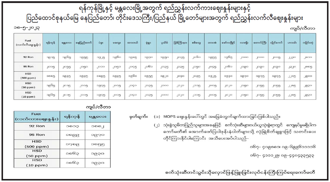 ရန်ကုန်မြို့နှင့် မန္တလေးမြို့အတွက် ရည်ညွှန်းလက်ကားဈေးနှုန်းများနှင့် ပြည်ထောင်စုနယ်မြေ နေပြည်တော်၊ တိုင်းဒေသကြီး/ပြည်နယ် မြို့တော်များအတွက် ရည်ညွှန်းလက်လီဈေးနှုန်းများ 05/18/2023