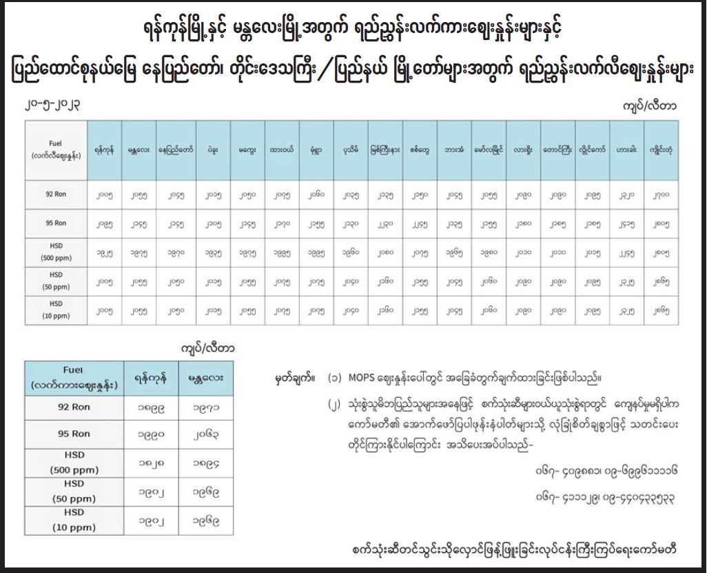 ရန်ကုန်မြို့နှင့် မန္တလေးမြို့အတွက် ရည်ညွှန်းလက်ကားဈေးနှုန်းများနှင့် ပြည်ထောင်စုနယ်မြေ နေပြည်တော်၊ တိုင်းဒေသကြီး/ပြည်နယ်မြို့တော်များအတွက် ရည်ညွှန်းလက်လီဈေးနှုန်းများ 05/20/2023