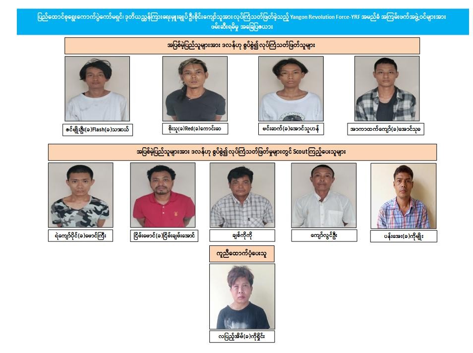 ဖမ်းဆီးရမိတရားခံများ၏ ထွက်ဆိုချက်အရ ရန်ကုန်မြို့အတွင်း အကြမ်းဖက်လုပ်ငန်းများ ဆောင်ရွက်ရန်နှင့် အပြစ်မဲ့ပြည်သူများအားဒလန်ဟု စွပ်စွဲ၍လုပ်ကြံသတ်ဖြတ်ရန် ရည်ရွယ်လျက် ၂၀၂၁ ခုနှစ်၊ အောက်တိုဘာလတွင် Yangon Revolution Force YRF အမည်ခံ အကြမ်းဖက်အဖွဲ့အား ဖမ်းဆီးရန်ကျန် တရားခံများဖြစ်သည့် ဥက္ကာလင်းယံ နှင့် Jame တို့မှ ခေါင်းဆောင်၍ ဇင်မျိုးဦး(ခ)Flash(ခ)သားငယ်၊ စိုးသူ (ခ)Red(ခ)ကောင်းဝေ၊ မင်းဆက်(ခ) အောင်သူဟန်၊ အာကာထက်ကျော်(ခ)အောင်သုခ၊ ရဲကျော်ပိုင်(ခ)မောင်ကြီး၊ ငြိမ်းမောင်(ခ)ငြိမ်းချမ်းအောင်၊ ချစ်ကိုကို၊ ကျော်လွင်ဦး နှင့် ဖမ်းဆီးရန် ကျန်တရားခံ များဖြစ်သည့် စိုးမိုးထွဋ်(ခ)တိုက်ဂါး၊ မင်းဟိန်းကျော်(ခ)လရောင်၊ လူမင်းထွေး (ခ)ကိုရှိုင်း၊ ဆိတ်ဖွား(ခ)ရဲကျော်၊ ဘိုမက်၊ ညီညီနိုင်(ခ)သံမဏိ၊ မလပ်ကီး၊ ကယ်ဗင်၊ ဂျိုကာ၊ 5 P ၊ ကျားကြီး၊ စောဟင်နရီထူး(ခ)အောင်လ အပါ အဝင် ၂၂ ဦးဖြင့် ဖွဲ့စည်းခဲ့ကြောင်း ဖော်ထုတ်သိရှိရသည်။