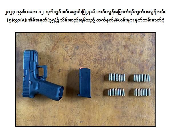 ဖမ်းဆီးရမိတရားခံ အာကာထက်ကျော်(ခ)အောင်သုခ ၏ ထွက်ဆိုချက် အရ ယင်းနေ့ နံနက်ပိုင်းတွင် မြောက်ဥက္ကလာပမြို့နယ်၊ အမှတ်(၁)ရပ်ကွက်၊ သုမိတ္တာ (၁၀)လမ်း၊ အိမ်အမှတ်(၄၀၇)၌ တရားခံ ရဲကျော်ပိုင်(ခ)မောင်ကြီးအား လက်လုပ်သေနတ် ကိုယ်ထည် ၁ ခု၊ လက်ပစ်ဗုံး ၁ လုံး၊ ၅.၅၆ ကျည် ၁၀ တောင့်၊ ပွိုင့် ၃၈ဝ ကျည် ၁၀ တောင့်၊ ၁၂ ဗို့ကျည် ၅ တောင့်၊ ကျည်ကာအင်္ကျီ ၈ ထည်၊ လက်ကိုင်ဖုန်း ၂ လုံးတို့ဖြင့်လည်းကောင်း၊ ဒဂုံမြို့သစ်(တောင်ပိုင်း) မြို့နယ်၊ အမှတ် (၆၃) ရပ်ကွက်၊ ရွှေတောင်ကြား (၅) လမ်း၊ အိမ်အမှတ်(၉၆၄၀)၌ တရားခံ ငြိမ်းမောင်(ခ)ငြိမ်းချမ်းအောင် အား Laptop ၁ လုံး၊ လက်ကိုင်ဖုန်း ၂ လုံး၊ ကွမ်းခြံကုန်းမြို့ နယ်၊ ဒရယ်လူးကျေးရွာနှင့် ကော့ဒွန်းကျေးရွာ အုပ်ချုပ်ရေးမှူးတံဆိပ်တုံး ၂ ခု၊ ရပ်ကွက်အုပ်ချုပ်ရေး မှူးတံဆိပ်တုံး ၂ ခု တို့ဖြင့်လည်းကောင်း ဖမ်းဆီးရမိခဲ့သည်။