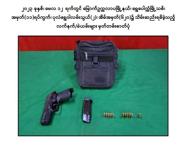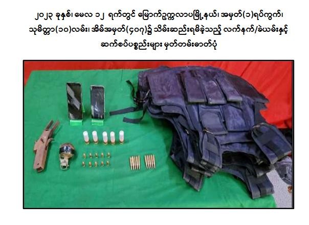 ဖြစ်စဉ်တွင် တရားခံ ၁၀ ဦးအား ပစ္စတို ၂ လက်၊ လက်လုပ်သေနတ် ကိုယ်ထည် ၁ ခု၊ လက်ပစ်ဗုံး ၁ လုံး၊ ကျည်မျိုးစုံ ၅၆ တောင့်၊ ကျည်ကာအင်္ကျီ ၈ ထည်၊ ကျေးရွာအုပ်ချုပ်ရေးမှူးတံဆိပ်တုံး ၂ ခု၊ ရပ်ကွက်အုပ်ချုပ်ရေးမှူးတံဆိပ်တုံး ၂ ခု၊ Laptop ၁ လုံး၊ လက်ကိုင်ဖုန်း ၄ လုံး တို့နှင့်အတူ ဖော်ထုတ်ဖမ်းဆီးရမိခဲ့သည်။