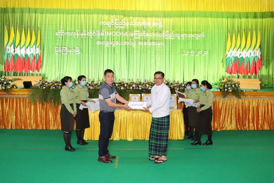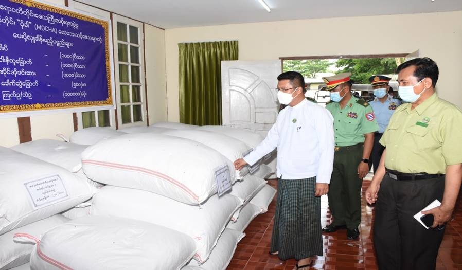 အလားတူ ရခိုင်ပြည်နယ်အတွင်းရှိ မုန်တိုင်းဒဏ်သင့်ပြည်သူများအတွက် ဧရာဝတီတိုင်းဒေသကြီးအစိုးရအဖွဲ့မှ လှူဒါန်းသည့် ငါးပိ ၁၀၀၀ ပိဿာ၊ ငါးနီတူခြောက် ၁၀၀၀ ပိဿာ၊ အိုင်အိုးအင်းဆား ၁၀၀၀ ပိဿာ၊ ခေါက်ဆွဲခြောက် ၅၀၀ ဖာ၊ ကြက်ဥ/ ဘဲဥ ၁၀၀၀၀၀ လုံးနှင့် အနောက်တောင်တိုင်းစစ်ဌာနချုပ်နှင့် ကွပ်ကဲမှုအောက် တပ်ရင်း/တပ်ဖွဲ့များမှ လှူဒါန်းသည့် ကြက်ဥ ၁၃၀၀၀ လုံး၊ ဘဲဥ ၁၀၀၀၀ လုံး၊ ငါးနီတူခြောက် ၂၀၀ ပိဿာတို့ကို စုဖွဲ့ပြင်ဆင်ထားရှိမှု အခြေအနေများအား ယနေ့နေ့လယ်ပိုင်းတွင် တိုင်းဒေသကြီးဝန်ကြီးချုပ် ဦးတင်မောင်ဝင်း၊ အနောက်တောင်တိုင်း စစ်ဌာနချုပ် တိုင်းမှူး ဗိုလ်မှူးချုပ် ကြည်ခိုင်နှင့် တာဝန်ရှိသူများက သွားရောက်ကြည့်ရှု၍ လိုအပ်သည်များ ညှိနှိုင်းဆောင်ရွက်ပေးသည်။ အဆိုပါ ရခိုင်ပြည်နယ်အတွင်းရှိ မုန်းတိုင်းဒဏ်သင့် ပြည်သူများအတွက် လှူဒါန်းသည့်ပစ္စည်းများအား တိုင်းစစ်ဌာနချုပ်မှ မော်တော်ယာဉ်များဖြင့်သယ်ဆောင်၍ ပုသိမ်မြို့မှ ရန်ကုန်မြို့ရှိ မင်္ဂလာဒုံလေဆိပ်သို့ပို့ဆောင်ကာ ၎င်းမှတစ်ဆင့် ရခိုင်ပြည်နယ်အတွင်းရှိ မုန်းတိုင်းဒဏ်သင့်ပြည်သူများသို့ ဆက်လက်ပေးပို့လှူဒါန်းသွားမည်ဖြစ်ကြောင်း သတင်းရရှိသည်။