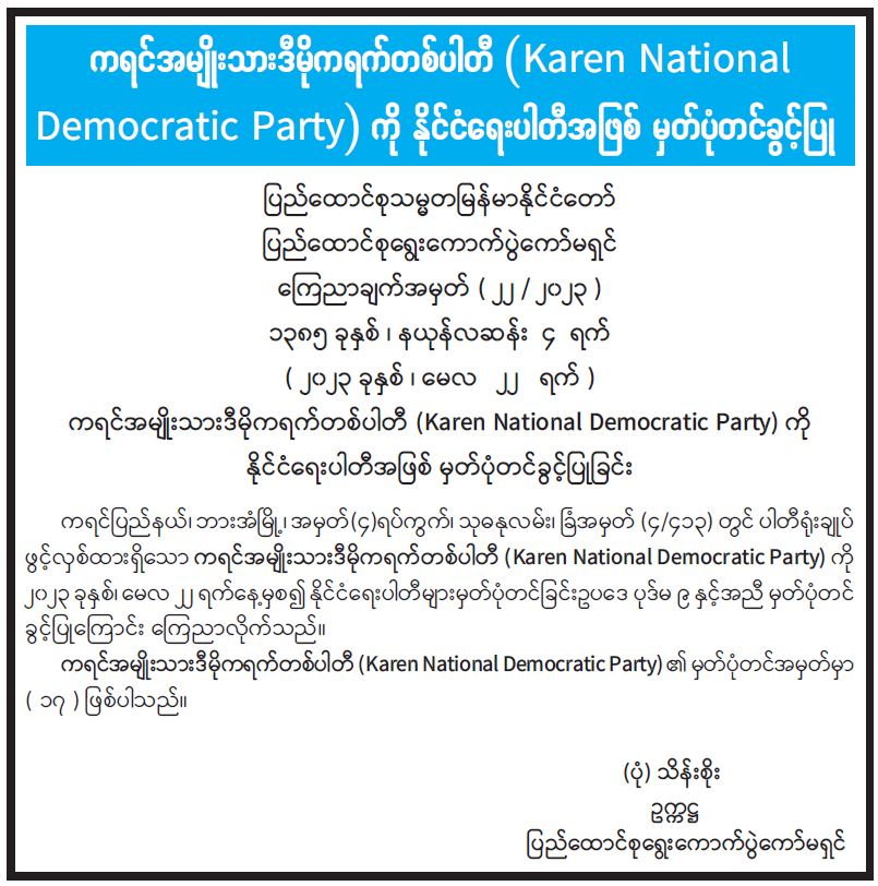 ကရင်အမျိုးသားဒီမိုကရက်တစ်ပါတီ (Karen National Democratic Party) ကို နိုင်ငံရေးပါတီအဖြစ် မှတ်ပုံတင်ခွင့်ပြု 05/23/2023