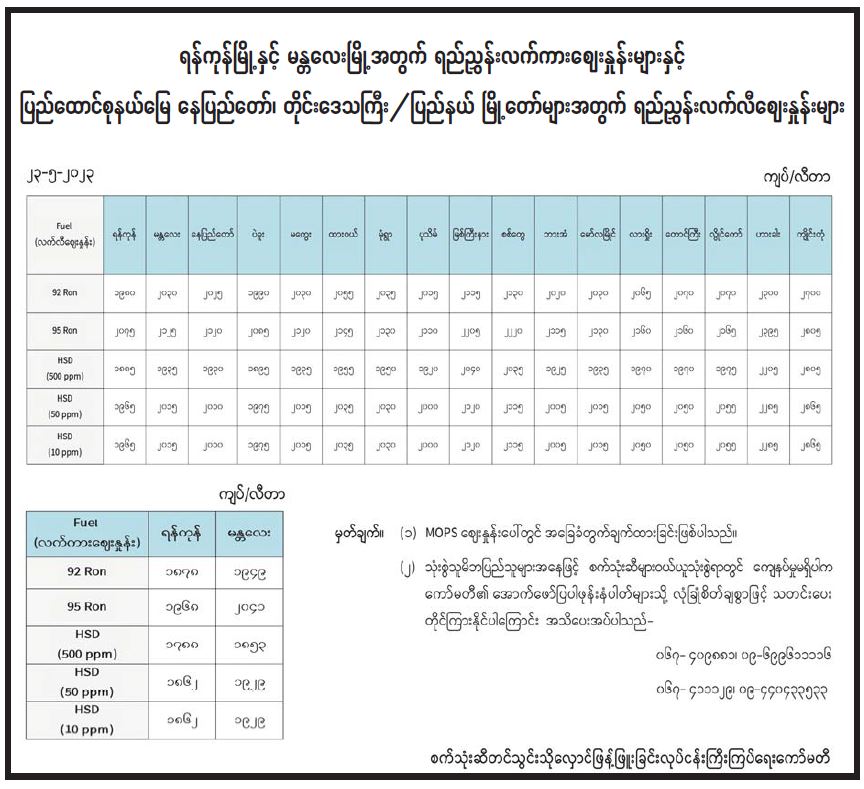 ရန်ကုန်မြို့နှင့် မန္တလေးမြို့အတွက် ရည်ညွှန်းလက်ကားဈေးနှုန်းများနှင့် ပြည်ထောင်စုနယ်မြေ နေပြည်တော်၊ တိုင်းဒေသကြီး/ပြည်နယ် မြို့တော်များအတွက် ရည်ညွှန်းလက်လီဈေးနှုန်းများ 05/23/2023