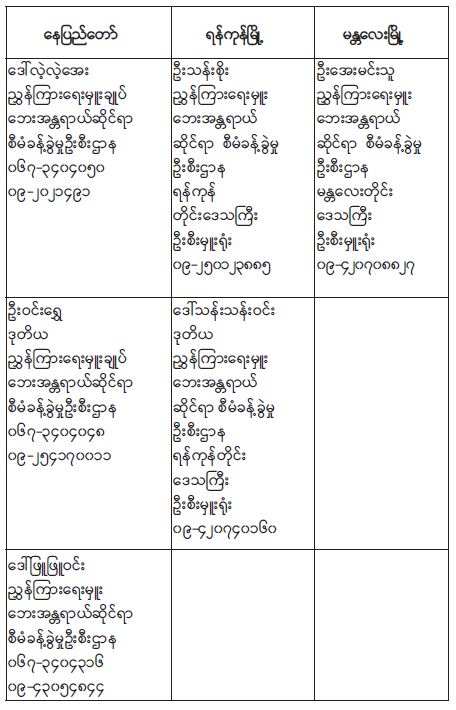 ၆။ လှူဒါန်းလိုသူများအနေဖြင့် အောက်ပါပုဂ္ဂိုလ်များသို့ ဆက်သွယ် မေးမြန်းလှူဒါန်းနိုင်ပါသည်-