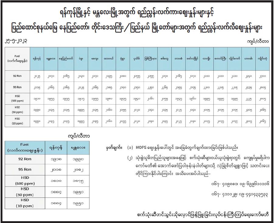 ရန်ကုန်မြို့နှင့် မန္တလေးမြို့အတွက် ရည်ညွှန်းလက်ကားဈေးနှုန်းများနှင့် ပြည်ထောင်စုနယ်မြေ နေပြည်တော်၊ တိုင်းဒေသကြီး/ပြည်နယ် မြို့တော်များအတွက် ရည်ညွှန်းလက်လီဈေးနှုန်းများ 05/25/2023