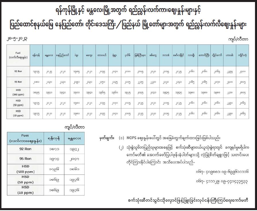 ရန်ကုန်မြို့နှင့် မန္တလေးမြို့အတွက် ရည်ညွှန်းလက်ကားဈေးနှုန်းများနှင့် ပြည်ထောင်စုနယ်မြေ နေပြည်တော်၊ တိုင်းဒေသကြီး/ပြည်နယ် မြို့တော်များအတွက် ရည်ညွှန်းလက်လီဈေးနှုန်းများ 05/28/2023