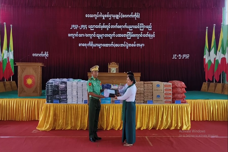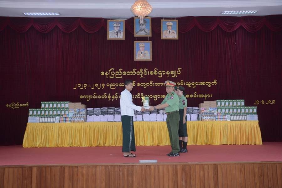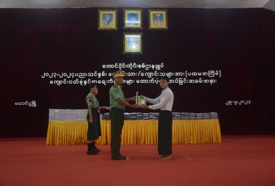 ၂၀၂၃-၂၀၂၄ ပညာသင်နှစ်တွင် တက်ရောက်ပညာသင်ကြားကြမည့် ကျောင်းသား၊ ကျောင်းသူများအား ကျောင်းဝတ်စုံနှင့် စာရေးကိရိယာများ ပေးအပ်ခြင်းကို ယနေ့နံနက်ပိုင်းတွင် နေပြည်တော်တိုင်းစစ်ဌာနချုပ်၊ အောင်ငြိမ်းအေးခန်းမ၌လည်းကောင်း၊ အရှေ့မြောက်တိုင်းစစ်ဌာနချုပ်၊ နယ်မြေခံတပ်နယ်ခန်းမ၌လည်းကောင်း၊ ရန်ကုန်တိုင်း ဒေသကြီးအစိုးရအဖွဲ့ရုံး မင်္ဂလာခန်းမ၌လည်းကောင်း၊ အနောက်တောင်တိုင်းစစ်ဌာနချုပ်၊ ပုသိမ်မြို့ရှိ ဧရာဝတီခန်းမ၌လည်းကောင်း၊ တောင်ပိုင်းတိုင်းစစ်ဌာနချုပ်၊ အေးချမ်းဖြိုးခန်းမ၌လည်းကောင်း အသီးသီးပြုလုပ်ကြရာ သက်ဆိုင်ရာ တိုင်းဒေသကြီးဝန်ကြီးချုပ်များ၊ တိုင်းစစ်ဌာနချုပ်များမှတိုင်းမှူးများနှင့် တာဝန်ရှိသူများ အရာရှိ၊ စစ်သည်၊ မိသားစုများ၊ ဆရာ၊ ဆရာမများ၊ ကျောင်းသား၊ ကျောင်းသူများ တက်ရောက်ကြသည်။