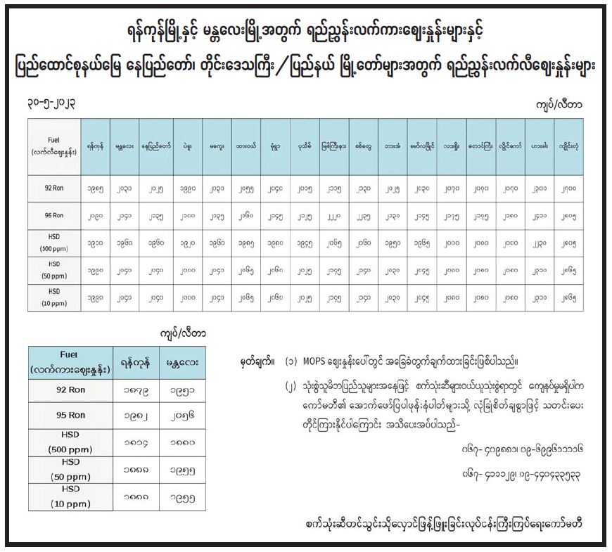 ရန်ကုန်မြို့နှင့် မန္တလေးမြို့အတွက် ရည်ညွှန်းလက်ကားဈေးနှုန်းများနှင့် ပြည်ထောင်စုနယ်မြေ နေပြည်တော်၊ တိုင်းဒေသကြီး/ပြည်နယ် မြို့တော်များအတွက် ရည်ညွှန်းလက်လီဈေးနှုန်းများ 05/30/2023