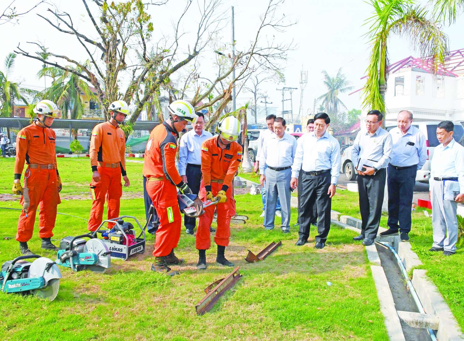 နိုင်ငံတော်စီမံအုပ်ချုပ်ရေးကောင်စီအဖွဲ့ဝင် ဒုတိယဝန်ကြီးချုပ်နှင့် ပြည်ထောင်စုဝန်ကြီး ဗိုလ်ချုပ်ကြီး တင်အောင်စန်းသည် ဒုတိယဗိုလ်ချုပ်ကြီး ထွန်းထွန်းနောင်၊ ပြည်နယ်ဝန်ကြီးချုပ် ဦးထိန်လင်းတို့နှင့်အတူ ယနေ့နံနက်ပိုင်းက မြန်မာနိုင်ငံ မီးသတ်တပ်ဖွဲ့၏ ကူညီကယ်ဆယ် ရေးလုပ်ငန်းများတွင် အသုံးပြုမည့် သစ်ပင်ဖြတ်စက်များ၊ သံဖြတ်စက်များနှင့် စွမ်းအားမြင့် ဟိုက်ဒရောလစ် ဖြတ်စက်များ လက်တွေ့အသုံးချ သရုပ်ပြသမှုကိုကြည့်ရှုပြီး ချို့ယွင်းပျက်စီး တာဝါတိုင်များအား ၎င်းဖြတ်စက်များအသုံးပြု၍ ဖယ်ရှားရှင်းလင်းခြင်း လုပ်ငန်းများကို အမြန်ဆောင်ရွက်သွားရန် မှာကြားခဲ့သည်။