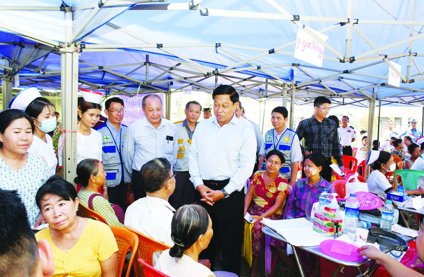 ယင်းနောက် ဗိုလ်ချုပ်ကြီး တင်အောင်စန်းနှင့်အဖွဲ့သည် ကျန်းမာရေး စောင့်ရှောက်မှု လာရောက်ခံယူကြသည့် လူနာများ၏ ကျန်းမာရေးအခြေအနေများကို မေးမြန်းပြီး အားပေး စကားပြောကြားကာ စားသောက်ဖွယ်ရာများ ပေးအပ်သည်။