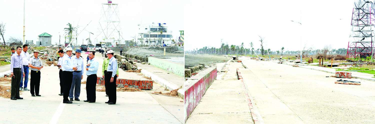 ဆက်လက်၍ ဆိုင်ကလုန်းမုန်တိုင်း မိုခါတိုက်ခတ်မှုကြောင့် စစ်တွေမြို့ ကမ်းနားလမ်းရှိ ကျောက်စီမြေထိန်းနံရံများ၊ ကွန်ကရစ်လမ်း၊ ပလက်ဖောင်းများ ပျက်စီးနေမှုနှင့် ပြန်လည်ပြုပြင် ဆောင်ရွက်သွားမည့်အခြေအနေများကို ကြည့်ရှုစစ်ဆေးသည်။