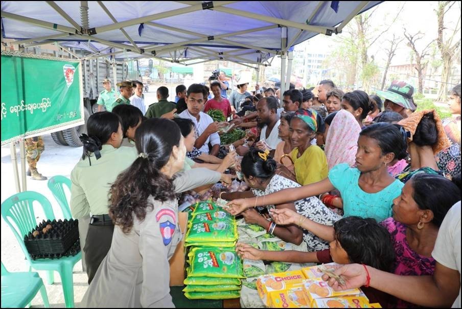 ဆိုင်ကလုန်းမုန်တိုင်း မိုခါတိုက်ခတ်မှုကြောင့် ပျက်စီးဆုံးရှုံးမှုများဖြစ်ပေါ်ခဲ့သည့် စစ်တွေမြို့ရှိ မုန်တိုင်းဒဏ်သင့် ဒေသခံပြည်သူများနှင့် ဌာနဆိုင်ရာ ဝန်ထမ်းများ၏ စားသောက်ရေး အဆင်ပြေစေရန်နှင့် မိမိတို့အလိုရှိရာ စားသောက်ကုန်ပစ္စည်းများကို ဈေးနှုန်းသက်သာစွာဖြင့် ဝယ်ယူ စားသောက်နိုင်ရေးအတွက် အနောက်ပိုင်းတိုင်း စစ်ဌာနချုပ် နယ်မြေခံတပ်မတော်သားများနှင့် တာဝန်ရှိသူများက ယနေ့တွင် စစ်တွေမြို့ ဦးဥတ္တမပန်းခြံ၌ ဟင်းသီးဟင်းရွက်များ၊ ဆန်၊ ဆီ၊ ဆား၊ အသား၊ ငါး၊ ကြက်ဥ၊ ဘဲဥ၊ နို့ထွက်ပစ္စည်းများ၊ ကြက်သွန်နီ၊ ကြက်သွန်ဖြူနှင့် တပ်မတော် စက်ရုံများမှ ထုတ်လုပ်သည့် ခေါက်ဆွဲခြောက်၊ ဘီစကစ်နှင့် စည်သွတ်ဘူးများဖြစ်သည့် အမဲသားဘူး၊ မျှစ်စားတော်ပဲဘူး၊ ကြက်သားအာလူးဘူး၊ ငါးတန်အချိုပေါင်းဘူး၊ ငါးသလောက်ဘူး၊ ငါးပိကြော်ဘူး၊ ပဲထောပတ်ဘူး၊ ပဲခရမ်းဘူး၊ သရက်သီးသနပ်ဘူး စသည့်စားသောက်ကုန်ပစ္စည်း များကို ပြင်ပပေါက်ဈေးထက် သက်သာသော ဈေးနှုန်းများဖြင့် ရောင်းချပေးခဲ့ရာ ဒေသခံပြည်သူ များနှင့် ဌာနဆိုင်ရာ ဝန်ထမ်းမိသားစုများက တစ်ခဲနက်ဝယ်ယူခဲ့ကြကြောင်းနှင့် ယခုကဲ့သို့ စားရေး အခက်အခဲဖြစ်ပေါ်နေ ချိန်တွင်သက်သာသော ဈေးနှုန်းများဖြင့် ရောင်းချပေးမှုအပေါ် တာဝန်ရှိသူများအား အထူးပင်ကျေးဇူးတင်ရှိကြောင်း ပြောကြားကြသည်။