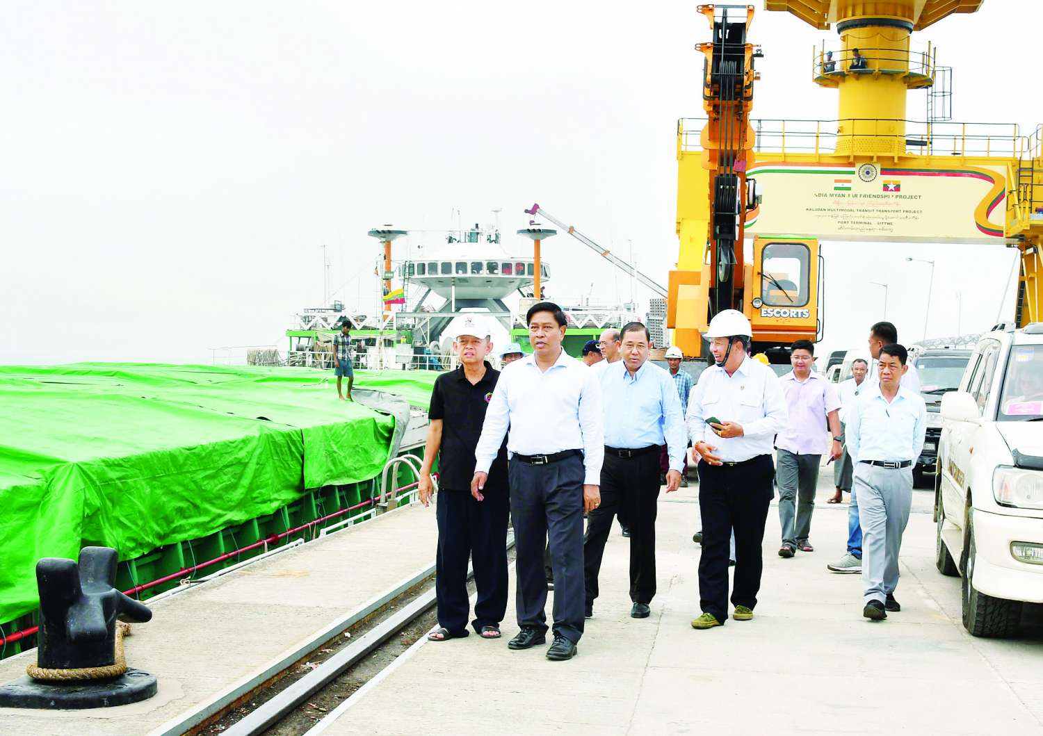 ဆက်လက်၍ ဗိုလ်ချုပ်ကြီး တင်အောင်စန်းနှင့်အဖွဲ့သည် စစ်တွေမြို့ ဘက်စုံသုံးဆိပ်ကမ်း၌ ကူညီကယ်ဆယ်ရေးနှင့် ပြန်လည်ထူထောင်ရေးပစ္စည်းများ သယ်ဆောင်လာသည့် MCL – 5 Yangon သင်္ဘောဆိုက်ကပ်ရောက်ရှိမှု၊ For Tune သင်္ဘောပေါ်မှ လျှပ်စစ်ပိုင်းဆိုင်ရာ ပြန်လည်ထူထောင်ရေးပစ္စည်းများအား စက်ယန္တရားကြီးများဖြင့် မော်တော်ယာဉ်များပေါ်သို့တင်ဆောင်နေမှု၊ မြန်မာ့ဆိပ်ကမ်းအာဏာပိုင်ဖောင်တော်ကြီး ဆိပ်ခံတံတား၌ AQUARIUS သင်္ဘောပေါ် မှ ပြန်လည်ထူထောင်ရေးလုပ်ငန်းများတွင် အသုံးပြုမည့် သစ်ခွဲသားများအား မော်တော်ယာဉ်များပေါ်သို့ မြန်မာနိုင်ငံရဲတပ်ဖွဲ့ဝင်များက တင်ဆောင်ပေးနေမှုကို ကြည့်ရှုစစ်ဆေးသည်။