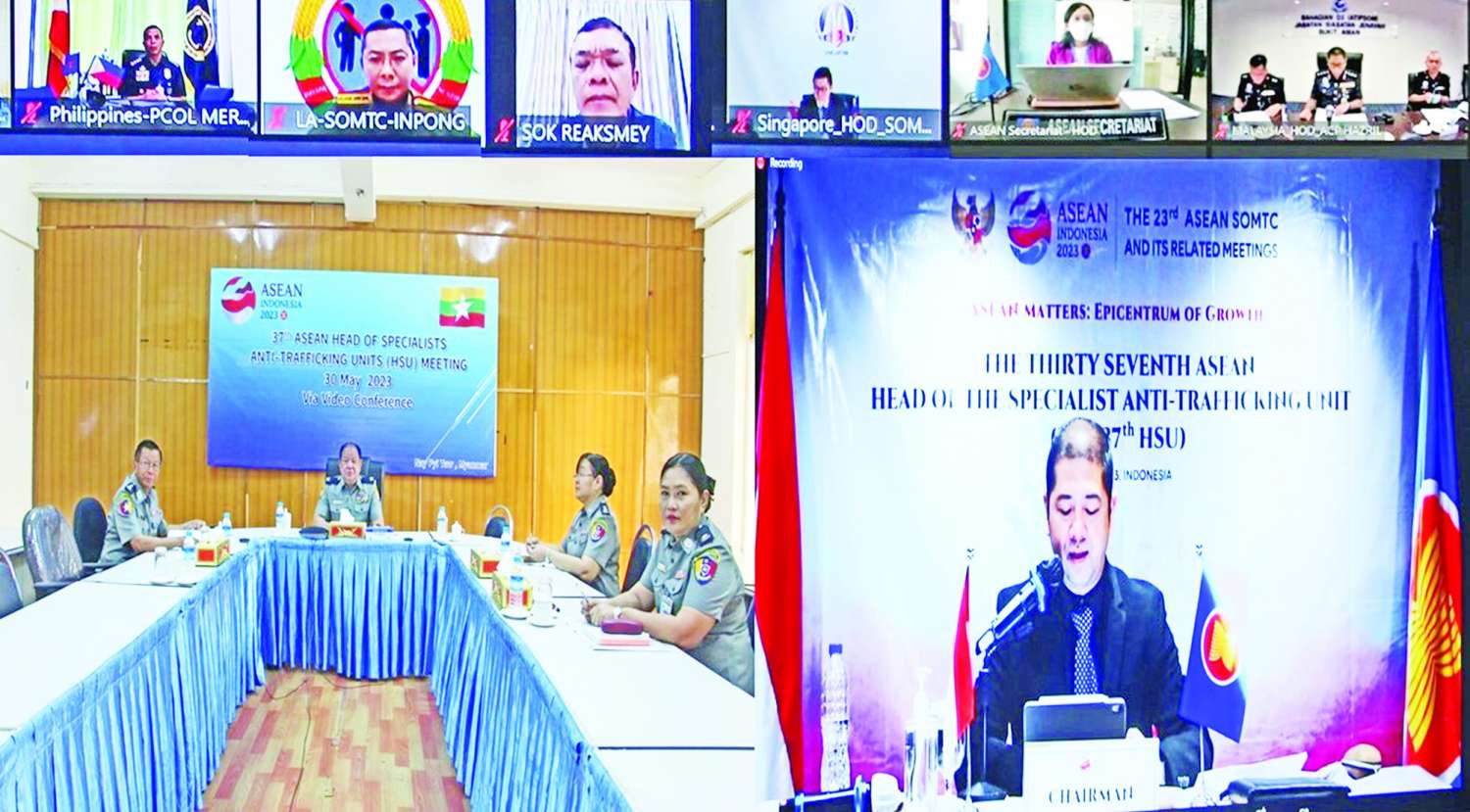 (၃၇)ကြိမ်မြောက် အာဆီယံလူကုန်ကူးမှုတားဆီးနှိမ်နင်းရေးဆိုင်ရာ အထူးအဖွဲ့ခေါင်းဆောင်များအစည်းအဝေး (The 37th ASEAN Heads of Specialist Anti-Trafficking Units – HSU)ကို ယနေ့နံနက် ၈ နာရီခွဲတွင် ရုံးအမှတ် (၃၈) လူကုန်ကူးမှုတားဆီးနှိမ်နင်းရေး ရဲတပ်ဖွဲ့မှူးရုံး အစည်းအဝေးခန်းမ၌ Video Conference ဖြင့် ကျင်းပရာ အစည်းအဝေးသို့ မြန်မာနိုင်ငံရဲတပ်ဖွဲ့၊ လူကုန်ကူးမှုတားဆီးနှိမ်နင်းရေး ရဲတပ်ဖွဲ့မှ တပ်ဖွဲ့မှူးရဲမှူးချုပ် မြင့်ထူးဦးဆောင်သော ကိုယ်စားလှယ် (၄) ဦးအပါအဝင် အာဆီယံအဖွဲ့ဝင်နိုင်ငံများမှ ကိုယ်စားလှယ်များ၊ အာဆီယံအတွင်းရေးမှူးချုပ်ရုံးမှ ကိုယ်စားလှယ်များ တက်ရောက်ခဲ့ကြသည်။