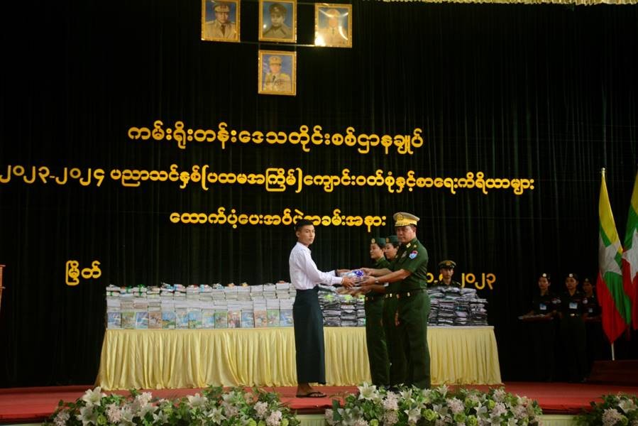 ၂၀၂၃-၂၀၂၄ ပညာသင်နှစ်တွင် တက်ရောက်ပညာသင်ကြားကြမည့် ကျောင်းသား၊ ကျောင်းသူများအား ကျောင်းဝတ်စုံ၊ စာရေးကိရိယာနှင့် ကျောင်းသုံးဗလာစာအုပ်များ ထောက်ပံ့ပေးအပ်ခြင်းကို ယနေ့တွင် အနောက်ပိုင်းတိုင်းစစ်ဌာနချုပ် မြောက်ဦးတပ်နယ်ခန်းမ၌ ပြုလုပ်ရာကာကွယ်ရေးဦးစီးချုပ်ရုံး(ကြည်း)မှ ဒုတိယဗိုလ်ချုပ်ကြီးဖုန်းမြတ်၊ တပ်ရင်း/တပ်ဖွဲ့မှူးများနှင့် အရာရှိ၊ စစ်သည်၊ မိသားစုဝင်များ တက်ရောက် ကြသည်။