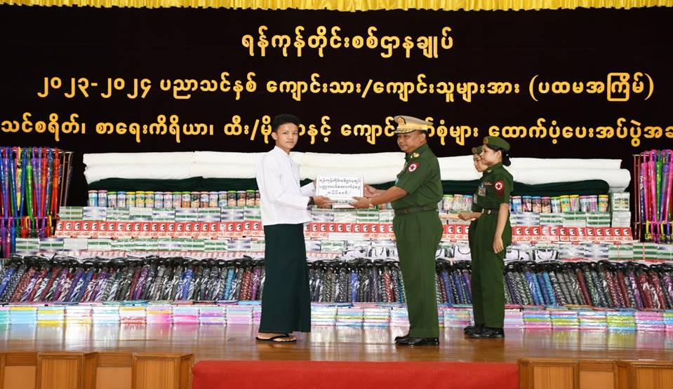 အလားတူ ကမ်းရိုးတန်းဒေသတိုင်းစစ်ဌာနချုပ်၊ တိုင်းရန်အောင်ခန်းမနှင့်ကွပ်ကဲမှုအောက် တပ်နယ်အသီးသီးတို့၌လည်းကောင်း၊ ရန်ကုန်တိုင်းစစ်ဌာနချုပ်၊ အနော်ရထာ ခန်းမ၌လည်းကောင်း၊ အနောက်ပိုင်းတိုင်းစစ်ဌာနချုပ်၊ စစ်တွေတပ်နယ်ရှိမေဃဝတီခန်းမနှင့် ကွပ်ကဲမှုအောက် တပ်နယ်အသီးသီးတို့၌လည်းကောင်း ကျောင်းသား၊ ကျောင်းသူများအား ကျောင်းဝတ်စုံ၊ စာရေးကိရိယာ၊ ကျောင်းသုံးဗလာစာအုပ်များနှင့် စတီးချိုင့်များထောက်ပံ့ပေးအပ်ခြင်းများကိုပြုလုပ်ကြရာ သက်ဆိုင်ရာတိုင်းစစ်ဌာနချုပ် များမှ တိုင်းမှူးများနှင့် တာဝန်ရှိသူများ၊ အရာရှိ၊ စစ်သည်၊ မိသားစုများ၊ ဆရာ၊ ဆရာမများ၊ မိဘများနှင့်ကျောင်းသား၊ ကျောင်းသူများ တက်ရောက်ကြသည်။
