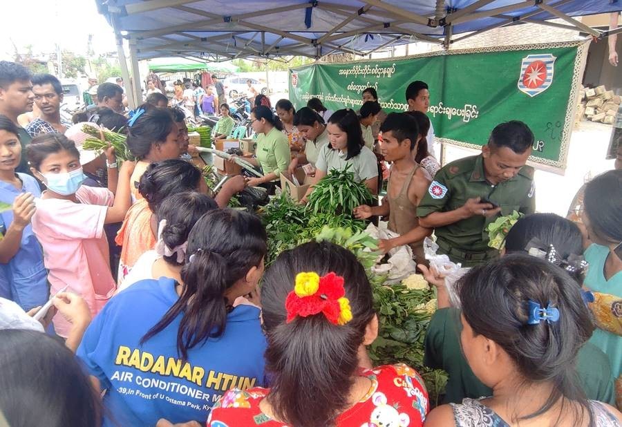 ဆိုင်ကလုန်းမုန်တိုင်း(မိုခါ)တိုက်ခတ်မှုကြောင့် ပျက်စီးဆုံးရှုံးမှုများဖြစ်ပေါ်ခဲ့သည့် စစ်တွေမြို့ရှိ မုန်တိုင်းဒဏ်သင့် ဒေသခံပြည်သူများနှင့် ဌာနဆိုင်ရာဝန်ထမ်းများ၏ စားသောက်ရေးအဆင်ပြေစေရန်နှင့် မိမိတို့အလိုရှိရာ စားသောက်ကုန်ပစ္စည်းများကို ဈေးနှုန်းသက်သာစွာဖြင့် ဝယ်ယူစားသောက်နိုင်ရေးအတွက် အနောက်ပိုင်းတိုင်းစစ်ဌာနချုပ်၊ နယ်မြေခံတပ်မတော်သားများနှင့် တာဝန်ရှိသူများက ယနေ့တွင် စစ်တွေမြို့၊ ဦးဥတ္တမပန်းခြံ၌ ဆန်၊ ဆီ၊ ဆား၊ အသား၊ ငါး၊ ကြက်ဉ၊ ဘဲဉ၊ နို့ထွက်ပစ္စည်းများ၊ ဟင်းသီးဟင်းရွက်များ၊ ကြက်သွန်နီ၊ ကြက်သွန်ဖြူနှင့် တပ်မတော်စက်ရုံများနှင့် မြန်မာစီးပွားရေးကော်ပိုရေးရှင်းတို့မှ ထုတ်လုပ်သည့် ခေါက်ဆွဲခြောက်၊ ဘီစကစ်နှင့် စည်သွပ်ဘူးများဖြစ်သည့် အမဲသားဘူး၊ မျှစ်စားတော်ပဲဘူး၊ ကြက်သား အာလူးဘူး၊ ငါးတန်အချိုပေါင်းဘူး၊ ငါးသလောက်ဘူး၊ ငါးပိကြော်ဘူး၊ ပဲထောပတ်ဘူး၊ ပဲခရမ်းဘူး၊ သရက်သီးသနပ်ဘူး စသည့် စားသောက်ကုန်ပစ္စည်းများ၊ ပုဂ္ဂလိက လုပ်ငန်းရှင်များ၏ စားကုန်ပစ္စည်းများ၊ လျှပ်စစ်ပစ္စည်းများနှင့် အိမ်ဆောက်ပစ္စည်းများကို ပြင်ပပေါက်ဈေးထက် သက်သာဈေးနှုန်းများဖြင့်ရောင်းချပေးခဲ့ရာ ဒေသခံပြည်သူများနှင့် ဌာနဆိုင်ရာ ဝန်ထမ်းမိသားစုများက တစ်ခဲနက်ဝယ်ယူခဲ့ကြကြောင်းနှင့် ယခုကဲ့သို့ စားရေးအခက်အခဲဖြစ်ပေါ်နေချိန်တွင် သက်သာသောဈေးနှုန်းများဖြင့် ရောင်းချပေးမှုအပေါ် တာဝန်ရှိသူများအား အထူးပင်ကျေးဇူးတင်ရှိကြောင်း သတင်းရရှိသည်။